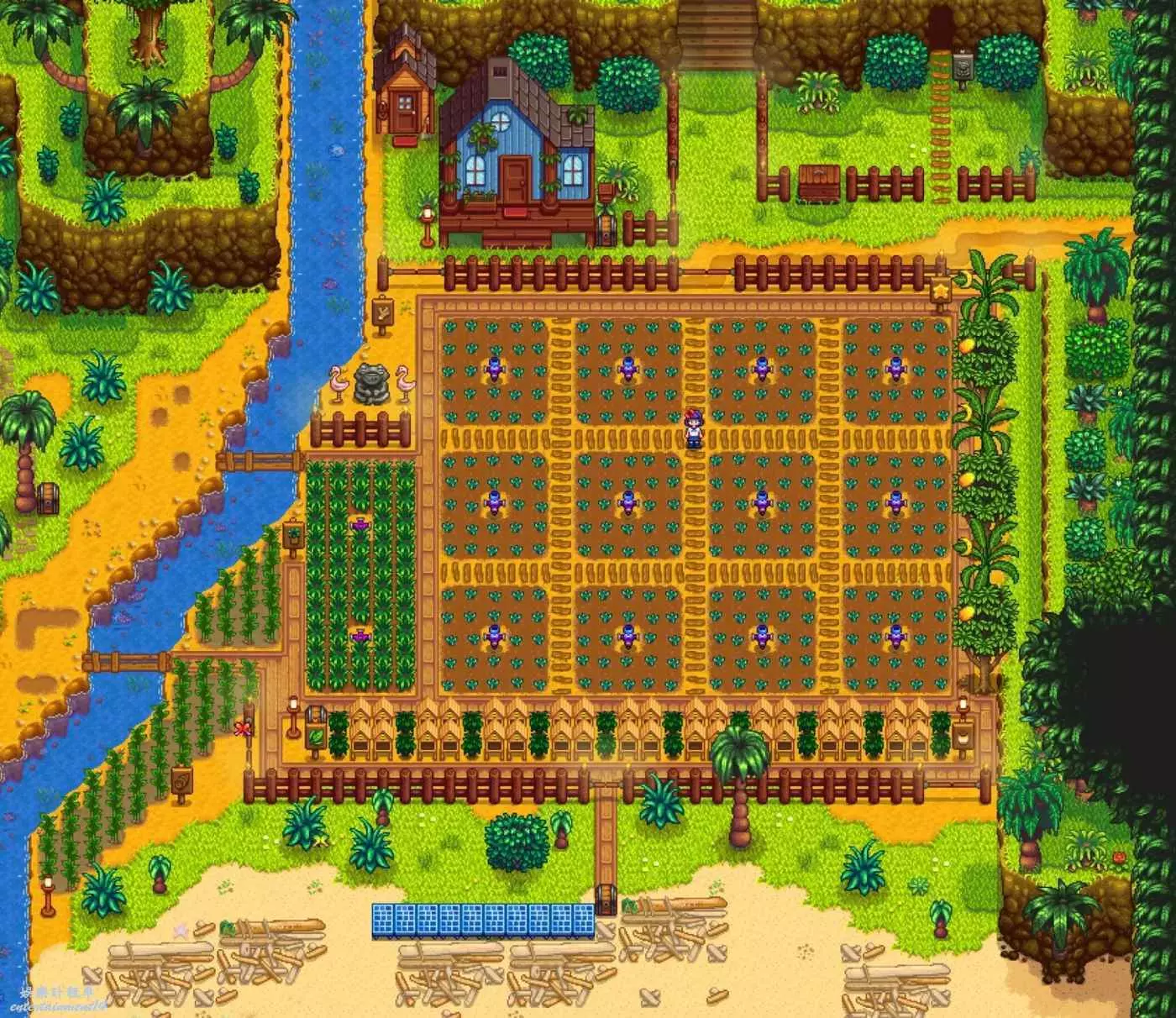 如果要參考我的農場佈局,可以用一下美化mod,因為我的佈局風格也是參照這個美化mod來設計的,換成原版貼圖不一定會有這樣的效果。比如原版的那四個圖騰塔我就不太喜歡,太高了,放在農場中間擋視野,放在邊上又看不到,用美化mod替換之後就好多了。