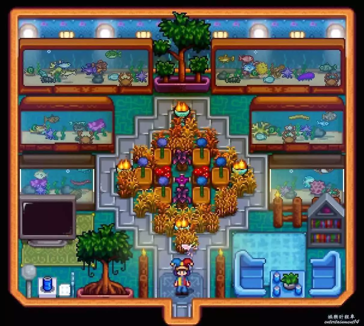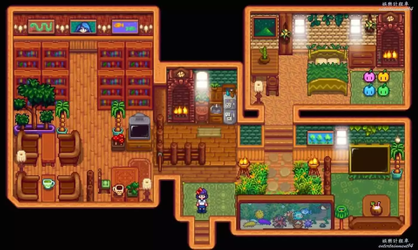 與農場佈局一樣,在室內裝修當中,地板牆紙的選擇以及隔斷物的選擇與擺放是至關重要的,地板牆紙儘量選擇同一色系的,不然會比較亂,隔斷可以用欄杆、書架甚至是魚缸,適當地選擇隔斷物,有的時候會有非常好的效果。