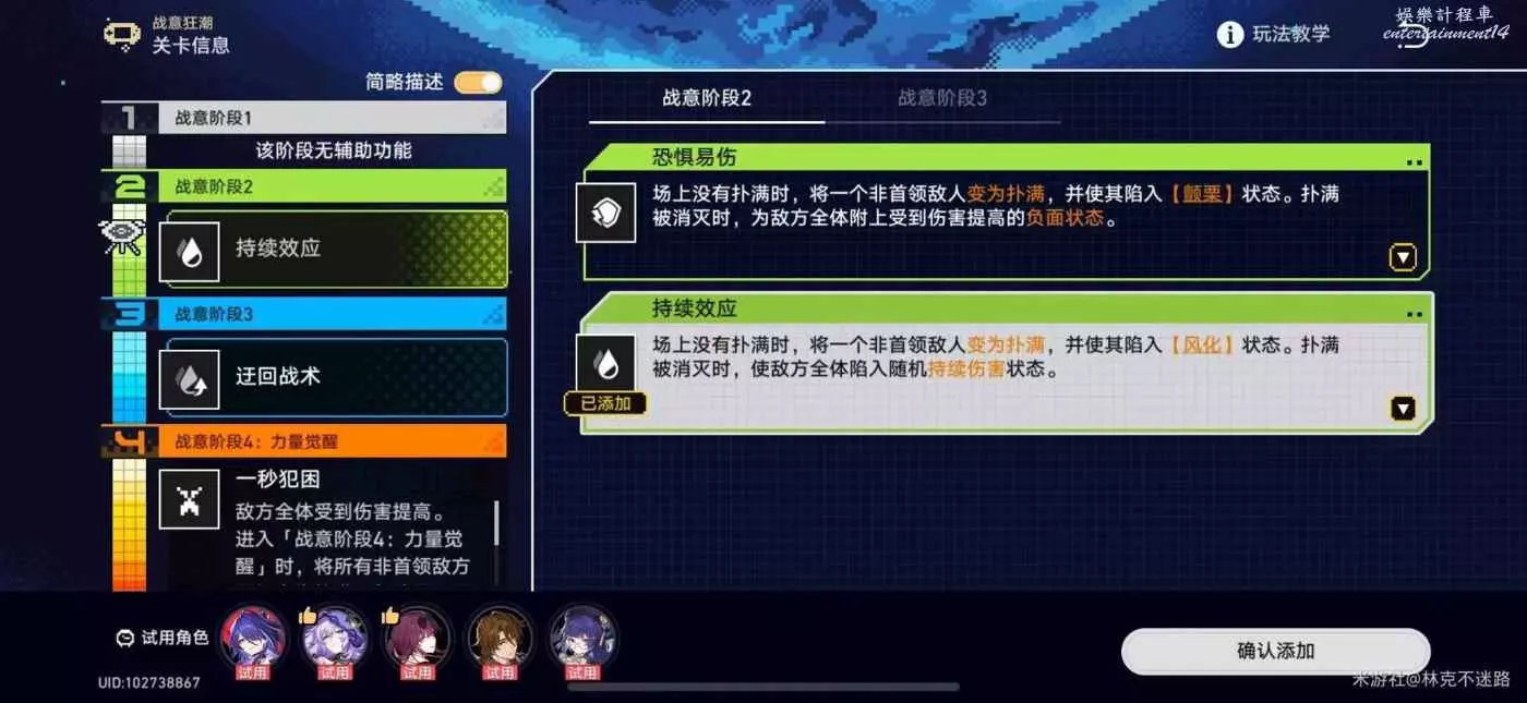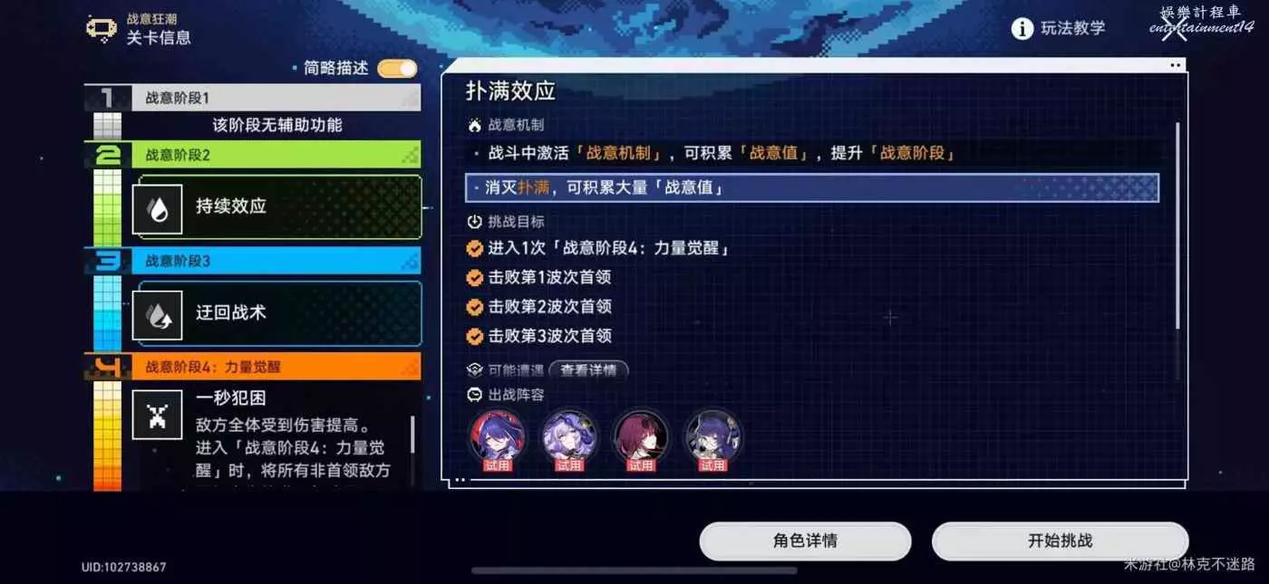 崩壞 星穹鐵道 2.1戰意狂潮第一關全試用通關攻略 13 4 月 2024-04-13 廣告 作者:林克不迷路 來源:米遊社論壇 活動時間 2024/04/13 12:00-2024/05/06 03:59 參與條件 完成開拓任務「雅利洛-VI」-「靜靜的星河」 第一關通關流程介紹 戰意機制選擇 陣容選擇 試用角色 黃泉、黑天鵝、卡芙卡、加拉赫、佩拉 陣容選擇 黃泉+黑天鵝+卡芙卡+佩拉/加拉赫 個人建議 本人試了很多次,用使用角色存在不定因素,自己黃泉跟佩拉練度高的換成自己的,使用試用加拉赫建議手動放大招。