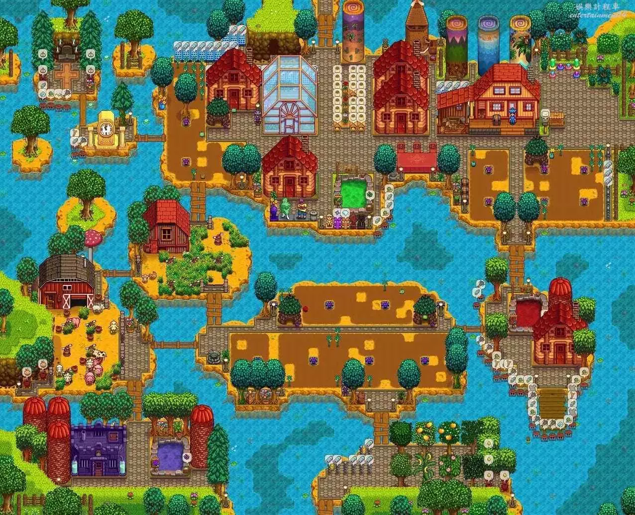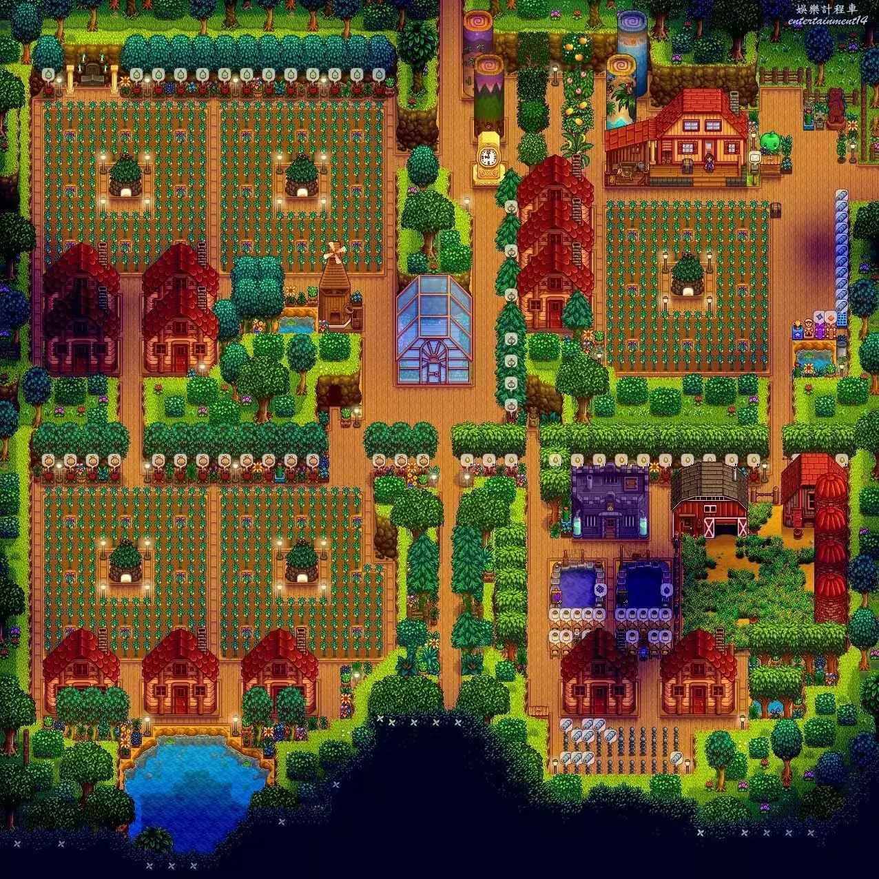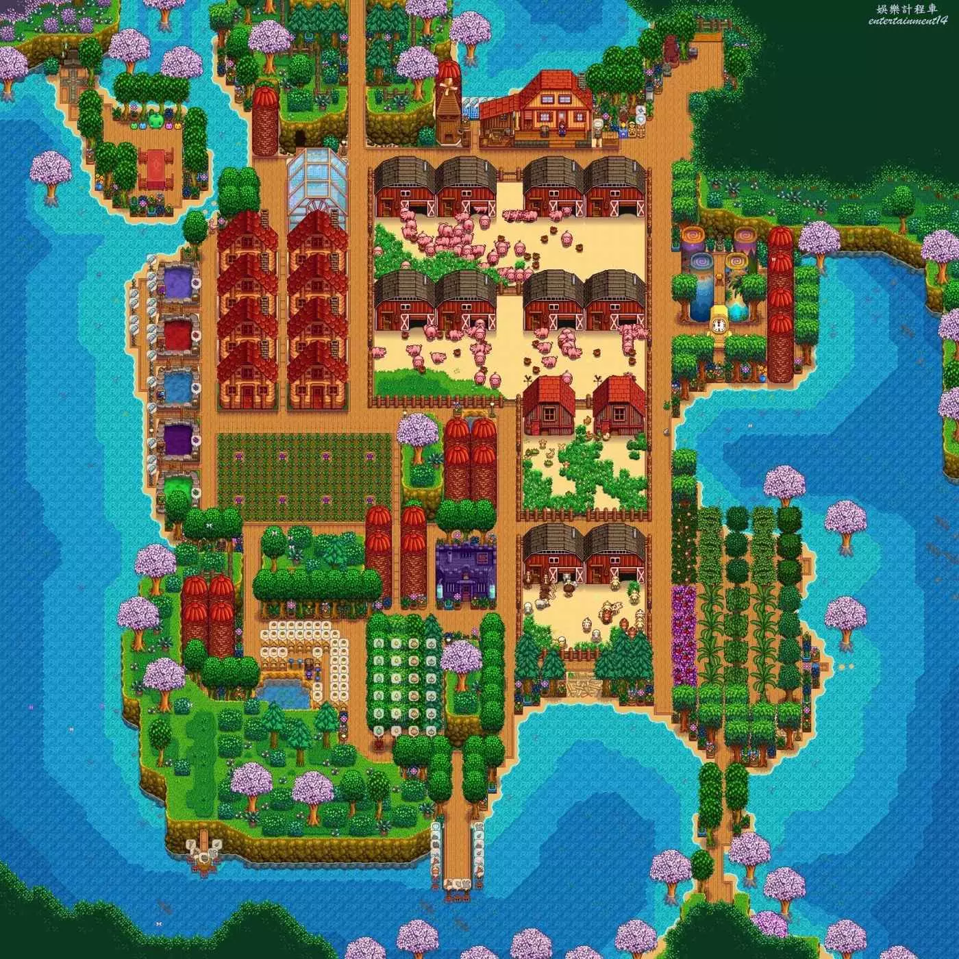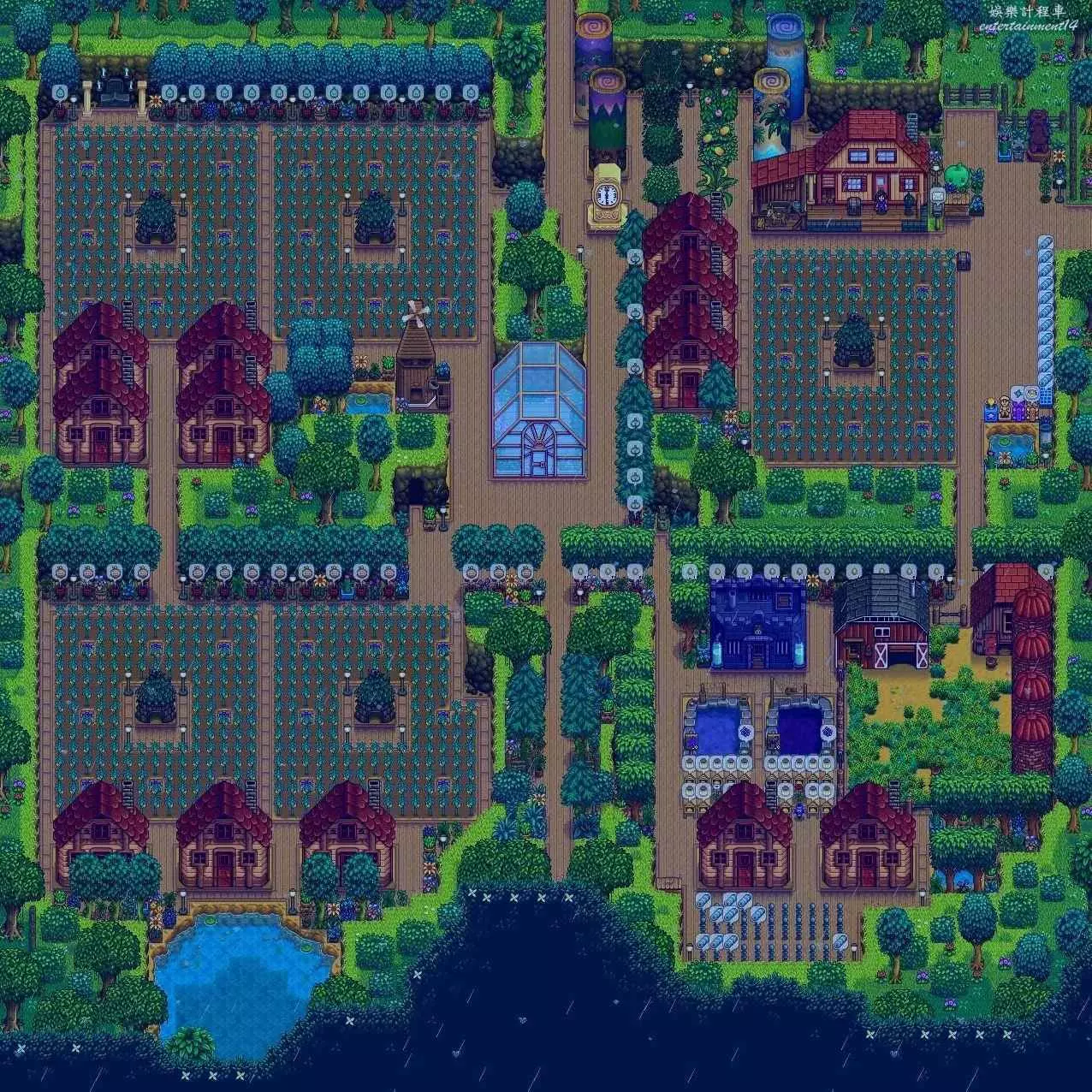 接下來分享一下我的農場佈局。我的佈局也只僅限在農場和薑島,沒有破壞小鎮包括礦場的地形,同樣因為都是一個人玩的,所以沒有考慮連線小屋的佈置。我也沒太高審美水平,所以我的佈置僅僅停留在實用的基礎上。所以沒有像其他大佬們那樣對農場和小鎮進行了美化設計,各個地圖佈局僅供參考。