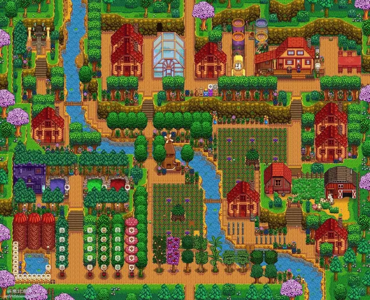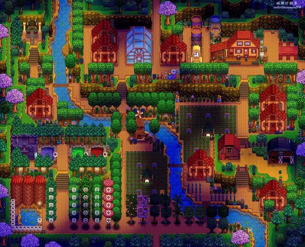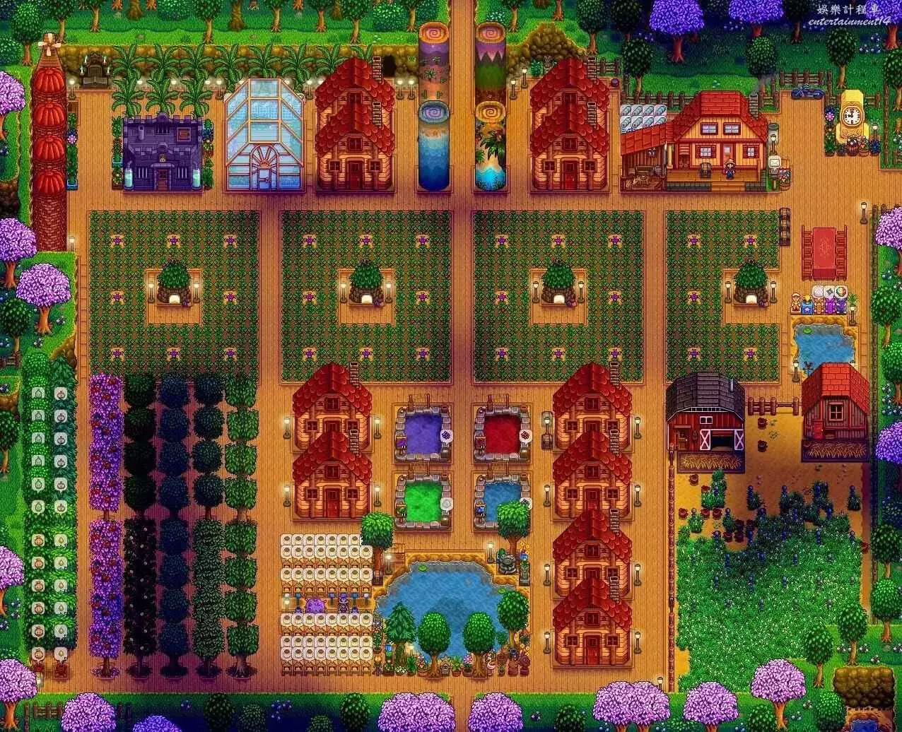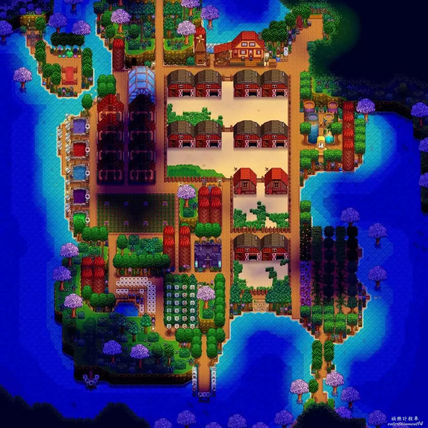 接下來分享一下我的農場佈局。我的佈局也只僅限在農場和薑島,沒有破壞小鎮包括礦場的地形,同樣因為都是一個人玩的,所以沒有考慮連線小屋的佈置。我也沒太高審美水平,所以我的佈置僅僅停留在實用的基礎上。所以沒有像其他大佬們那樣對農場和小鎮進行了美化設計,各個地圖佈局僅供參考。