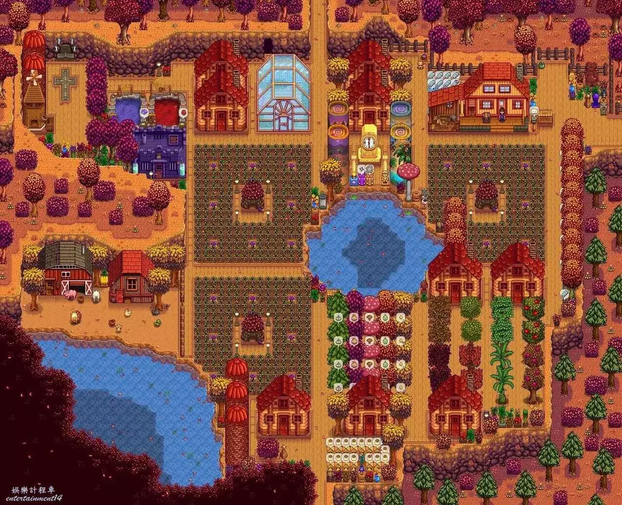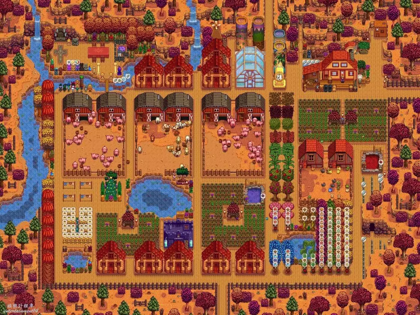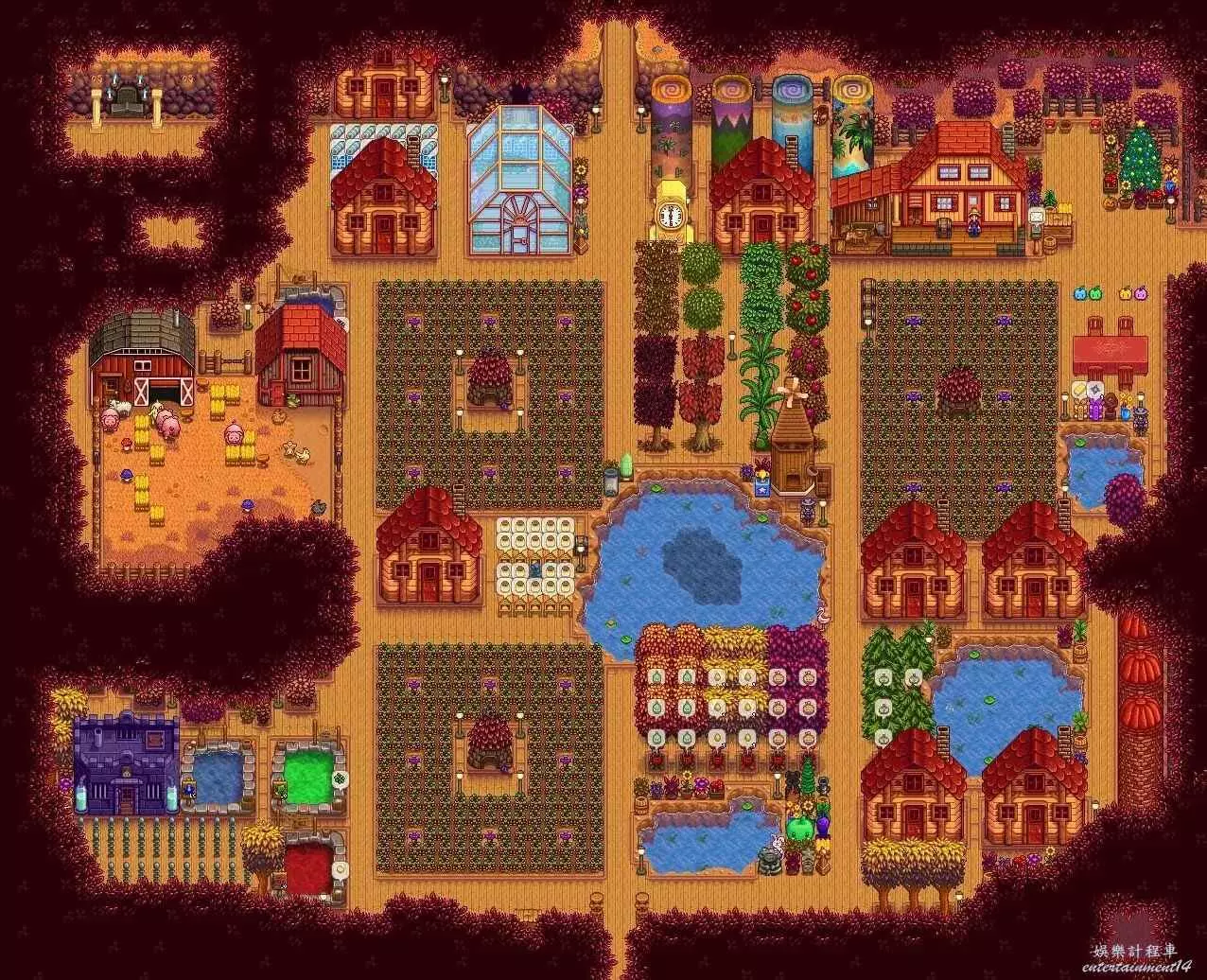 新地圖說實在的我感覺很尷尬,本應該以放牧為主的農場(牧場),但面積不如沙灘農場,可種植的土地少而且被池塘分割,似乎唯一的優點就是藍色韌草了,不過我後期也沒用。佈置起來也稍微有點麻煩,但還算滿意。