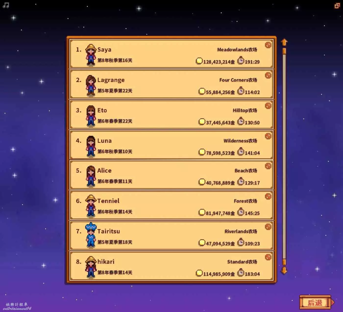 我也久違的回到星露谷繼續農夫的生活,新地圖完美結局後,這個遊戲對我來說也就暫時告一段落了,1100h 的遊戲時長確實耐玩,但又因為重複度高會有點無聊。當初玩的時候只把我玩的第一張地圖標準農場完成了100%進度,似乎後期的農場佈局就成了這個遊戲最好玩的地方了。