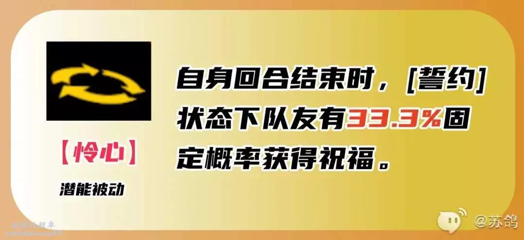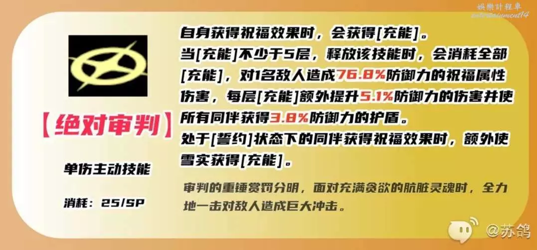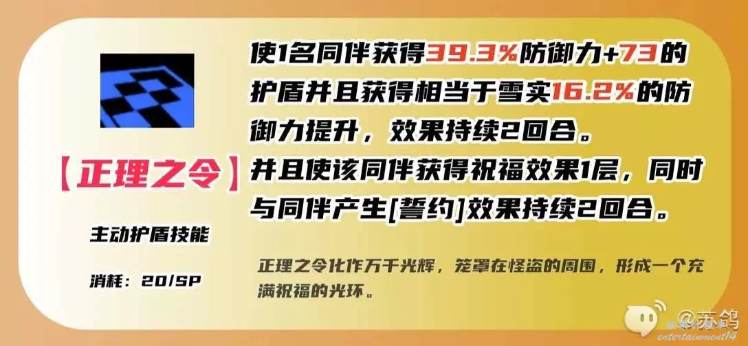 群傷主動技能,對敵人造成防禦力加成的祝福屬性傷害,同時使自身和有【誓約】的同伴都獲得一層祝福效果。