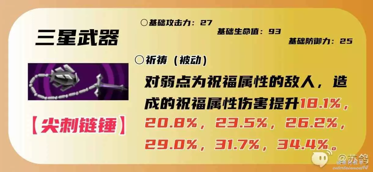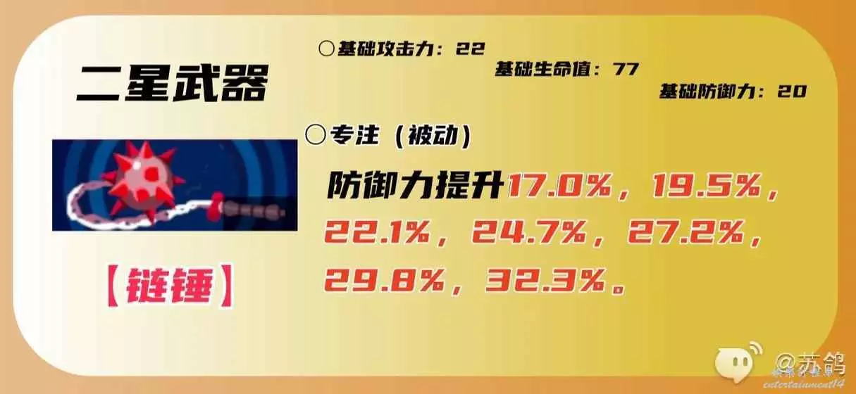 二星專屬武器,一般不推薦使用,因為基礎屬性加成太低了,但是藤川雪實的三星武器是針對祝福屬性敵人的,二星武器【鏈錘】的被動直接加防禦,比起三星武器的隊伍適配性和提升藤川雪實自身輸出和生存能力更強一些,沒有四星五星武器的時候,也可以使用二星武器過度。