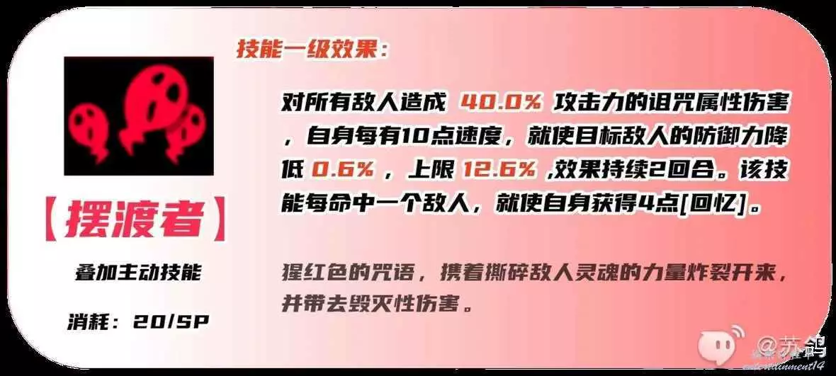 群傷疊加被動【回憶】的主要技能,同時可以根據自身速度降低敵人防禦力,持續兩回合,可以有效的起到增傷作用!