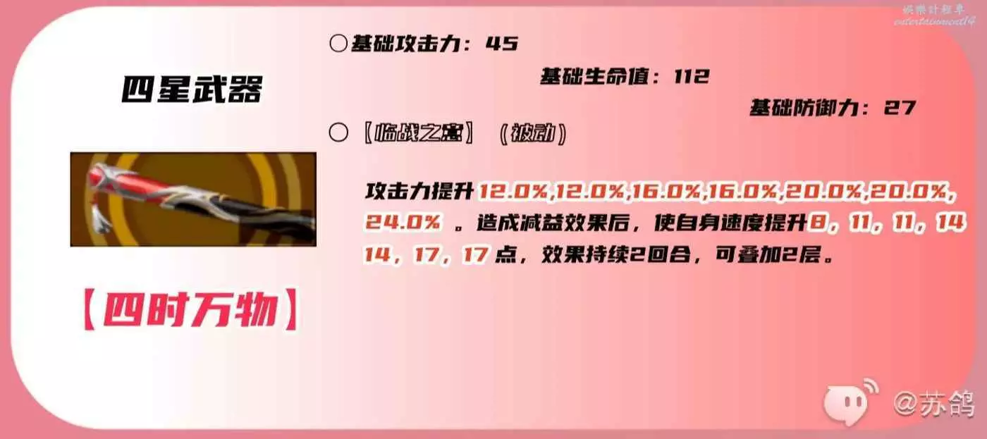 四星專屬武器,造成減益效果,即可提供移動速度加成,並且可以疊加2層,速度提高對於李瑤玲來說是可以增加輸出和輔助能力的,如果沒有五星武器,可以儘量提升【四時萬物】的改造等級。