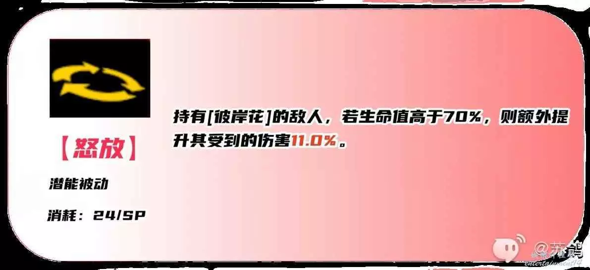 潛能被動技能,潛能(突破)4級後解鎖,對於持有【彼岸花】的敵人,若敵人生命值高於70%,額外造成11%(隨技能等級提升增加)的傷害。