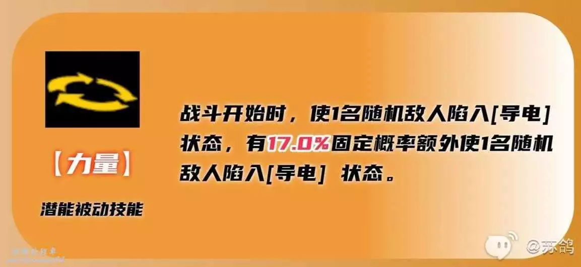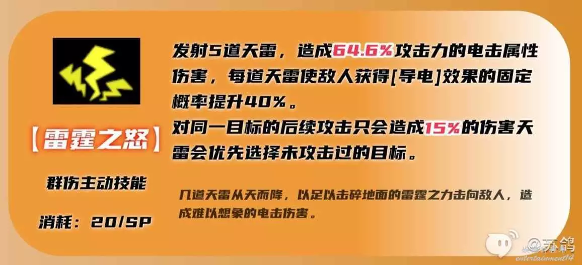①單體強力攻擊,如果攻擊處於導電狀態的敵人,還有50%的幾率使敵人陷入觸電狀態,持續2回合。