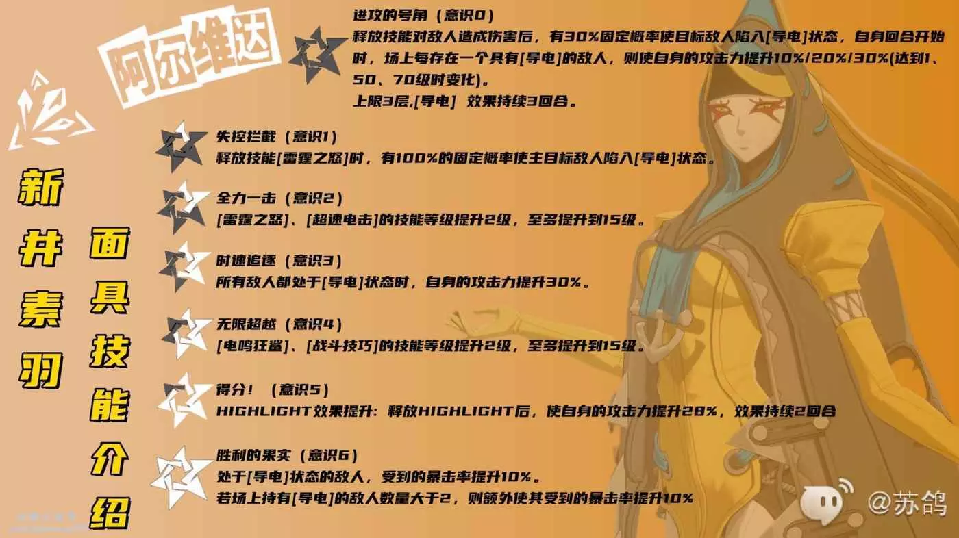 ①新井素羽的主要輸出技能,群傷單攻都可以,技能五段傷害可以更好的觸發導電異常狀態,從而起到提升新井素羽攻擊力的效果。
