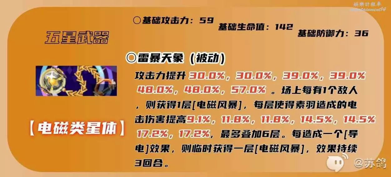 新井素羽的五星專屬武器,超高的攻擊力加成,配合武器被動【電磁風暴】賜予的電屬性傷害加成,敵人越多傷害加成越高,並且每造成一個【導電】效果,都可以疊加一次【電磁風暴】的傷害加成(最多疊加6層)。