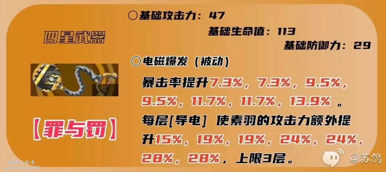 四星專屬武器,提升暴擊率的同時,會根據【導電】層數(上限3層)提升新井素羽的攻擊力,暴擊率的提升配合【觸電】狀態的暴擊率加成,可以保證暴擊率的觸發頻率。