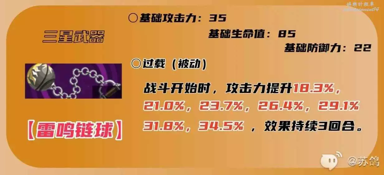 3星過度武器,開局前三回合穩定的提升攻擊力,可以保證前三回合的輸出,但後續只能吃到武器的基礎屬性加成,如果是爆發隊伍,這個武器也挺適合。