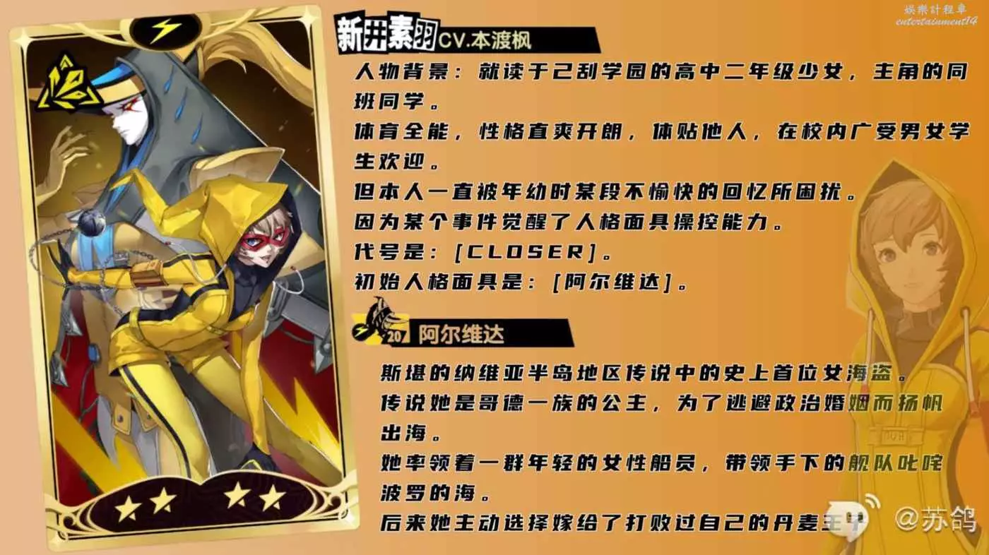 阿爾維達:作為新井素羽的專屬面具,隨著面具意識的進階,可以提升很多對導電異常狀態的敵人的傷害,並且可以更好的觸發導電效果,導電狀態的敵人越多,新井素羽的傷害越高,是一個很不錯的群傷角色。