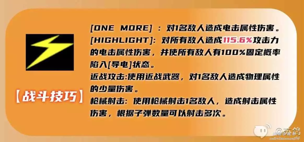 ②【HIGHLIGHT】:群體增傷大招,有100%的固定幾率使敵人陷入導電狀態。