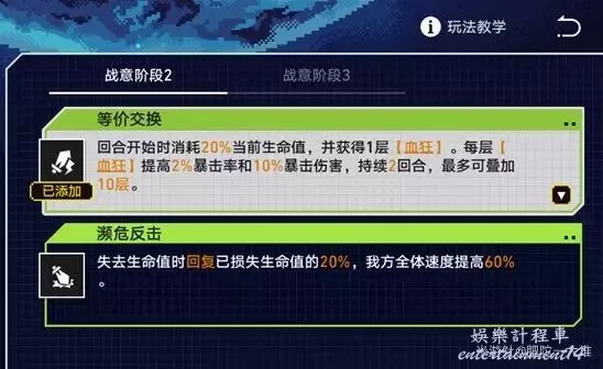 階段2的等價交換buff是用額外的血量消耗來換取傷害提升,瀕危反擊buff是額外恢復血量同時提高全體速度,值得一提的是這兩個buff對階段4中的【呐喊】的疊層起到的作用是一樣的。這裡建議大家選擇等價交換buff,一方面等價交換buff額外消耗血量能更快的觸發刃天賦的追加傷害,另一方面,經過我的實際體驗,速度的提升不如直接傷害提升來的實在,同時會出現亂軸的情況,而且瀕危反擊的速度提升效果也無法疊加。