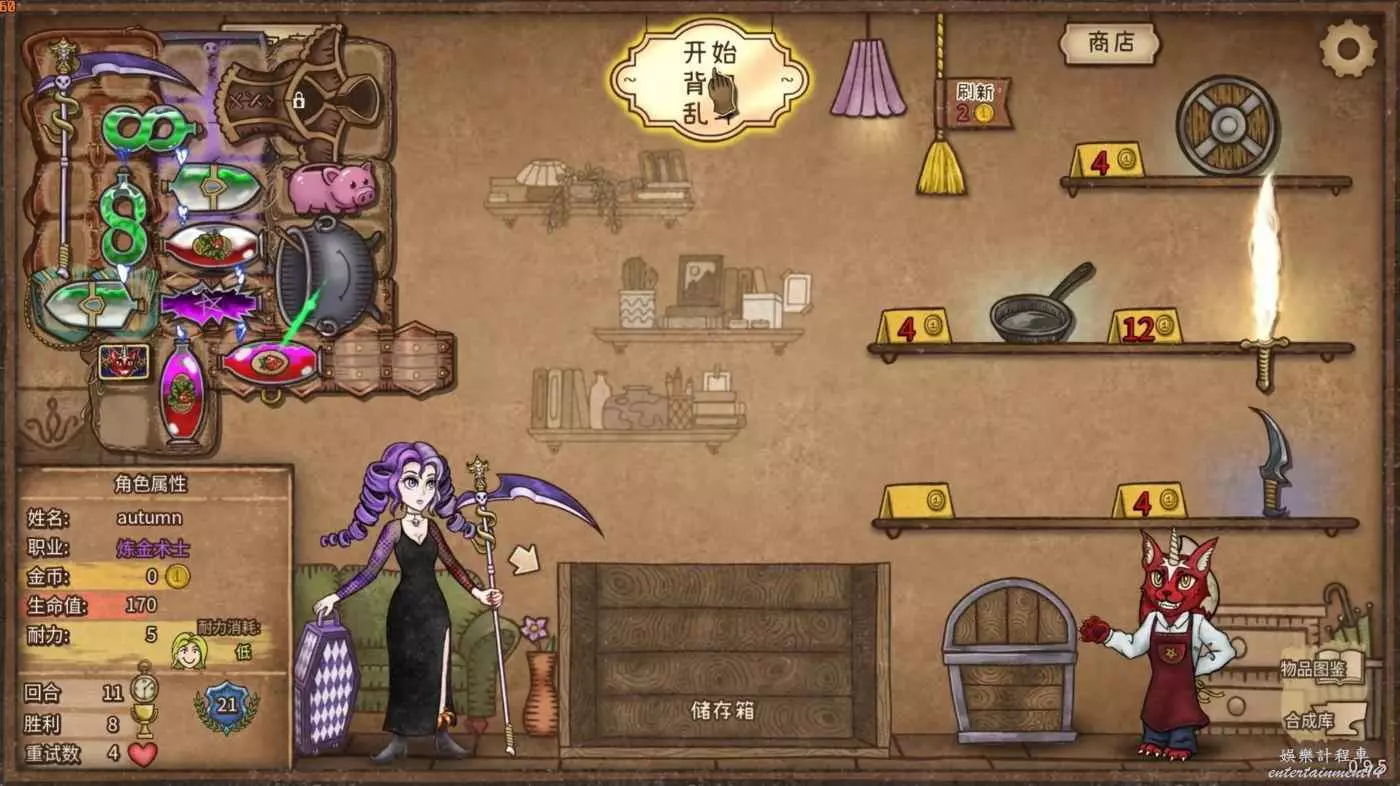中期的目標是找到毒鐮刀、3瓶毒藥和4瓶甲藥。每回合儘量把1塊的刷新次數用完,即使找到買不起需要鎖,因為這套需要的東西種類比較少而且固定,刷完沒東西買還是可能會遇到的,有空閒格子看到存錢罐和會員卡也可以拿。找到毒鐮刀前先用著前期雜七雜八的東西,找到毒鐮刀之後把前期拿的體系外的東西全部賣掉,騰錢騰格子,找到4瓶甲藥前的擺法如圖1所示,加速包給毒鐮刀吃,這個時候還要靠它打傷害。
