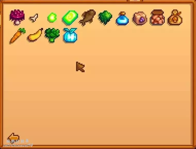 熔岩菇、骨頭碎片、放射性礦石、放射性礦錠、熏魚、苔蘚、神秘糖漿、葡萄乾、果乾、蘑菇乾貨、胡蘿蔔、金皮西葫蘆、西藍花、霜瓜