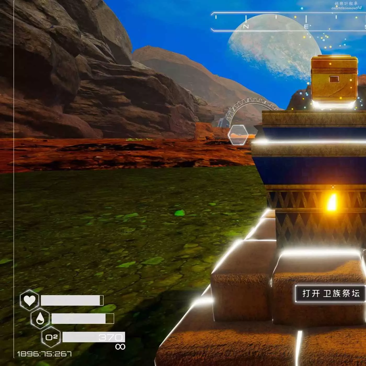 左邊的石板說之前星球毀滅的時候還是有部分人選擇了逃離,他們在星球上留下了10把鑰匙,如果有人搜集齊了可以追隨他們的足跡。右邊的箱子裡有一個藍圖,可以解鎖鑰匙探測器。造好並裝備探測器就可以發現地圖上隱藏的衛所鑰匙。