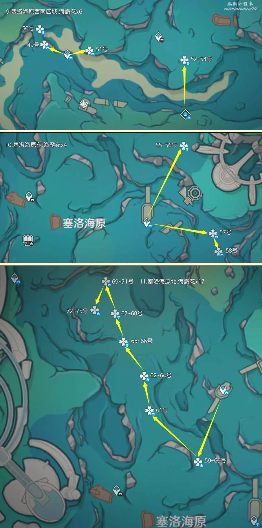 海露花點位分佈在楓丹全區域內,絕大部分都在水域裡,其中高效率點位有希望之路、塞洛海原和柔燈港北這幾個,可重複採集數量有120朵;製作路線時儘量遵循從上往下游,視野高好看清,方便旅行者探索。