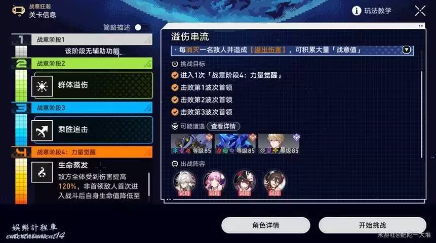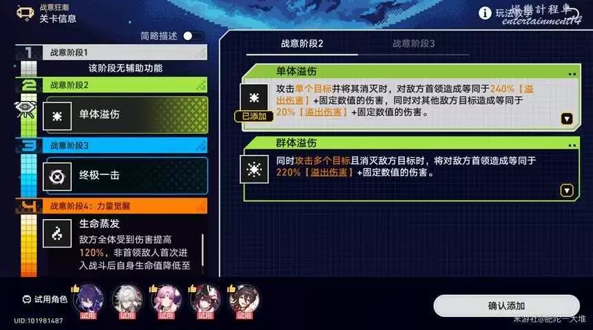 選擇單體溢傷+終極一擊,角色選擇就是希兒、符玄、花火、停雲。操作思路就是希兒不要去打精英怪,要不停地去打小怪,利用單體溢傷的buff來對精英怪造成傷害,畢竟希兒算上再現能夠觸發兩次單體溢傷比直接打精英怪的傷害高的多,小怪的話優選攻擊血量少且量子弱點的,這樣能夠保證希兒擊殺對方造成更高的溢出傷害同時觸發再現。不建議使用自動,因為自動的希兒經常會把終結技打到精英怪的身上,會虧損很多傷害很難在結束前打完第三波的傑帕德。