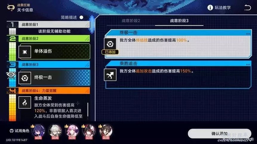 階段3的buff,終極一擊提高終結技傷害,乘勝追擊提高追加攻擊傷害,很明顯終極一擊更適合希兒,乘勝追擊更適合景元。