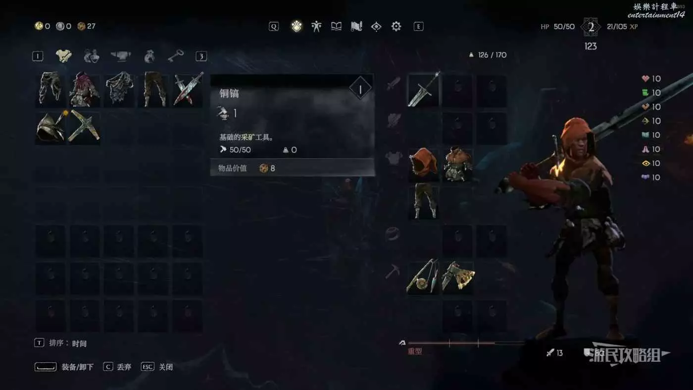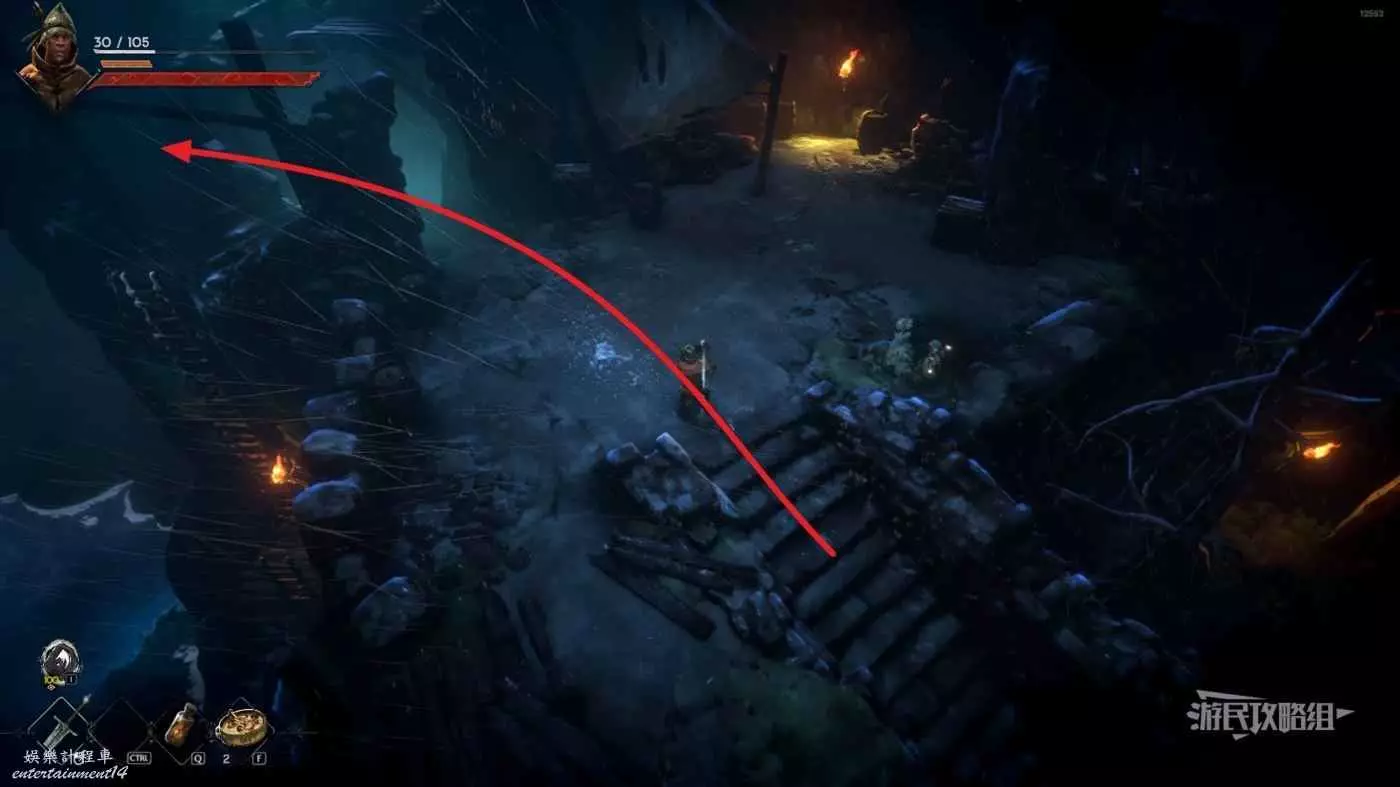 沿著缺口外的木板往下走,拾取藍色戰利品即可獲得銅鎬。