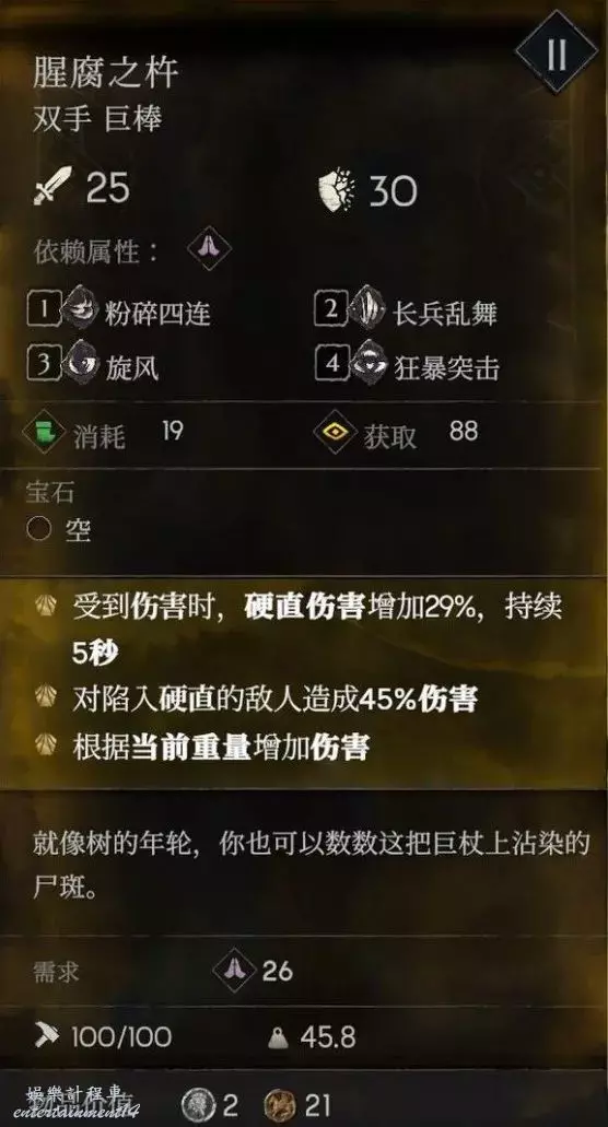惡意不息 (No Rest for the Wicked) 腥腐之杵獲取方法 21 4 月 2024-04-21 廣告 作者:麵條大鴿 來源:惡意不息吧 大棒子,要求是26純信仰非常離譜,全是輸出技能。沒實戰用過,有點醜,看屬性輸出應該很暴力。主線推到無名山,最後雙頭boss掉落