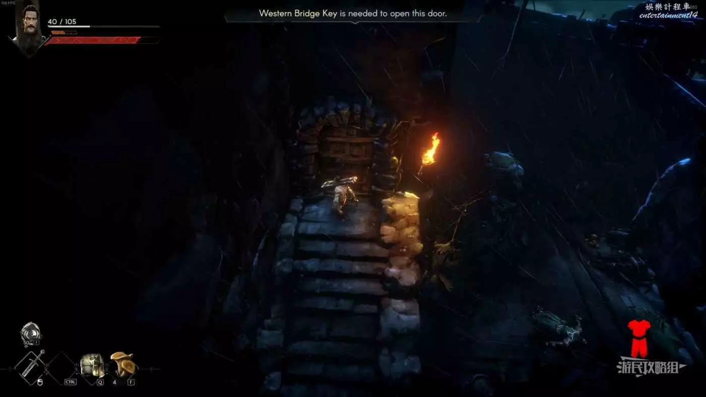 到達聖城並觸發支線【旅館老闆的丈夫】後,需要返回淺灘區域尋找NPC戈登。淺灘低語的正上方有一座高塔,爬兩個梯子到達高塔頂層,跳過斷橋的缺口即可找到旅館老闆的丈夫戈登,他頭上有個技術呢感嘆號,旁邊還有一具屍體,屍體旁邊有個戰利品,這個戰利品就是【西橋鑰匙】,拾取即可。