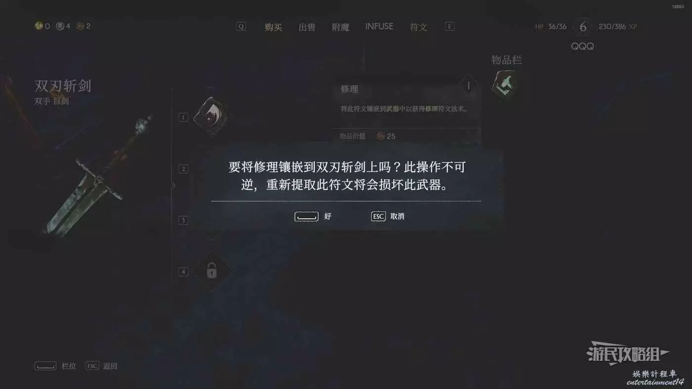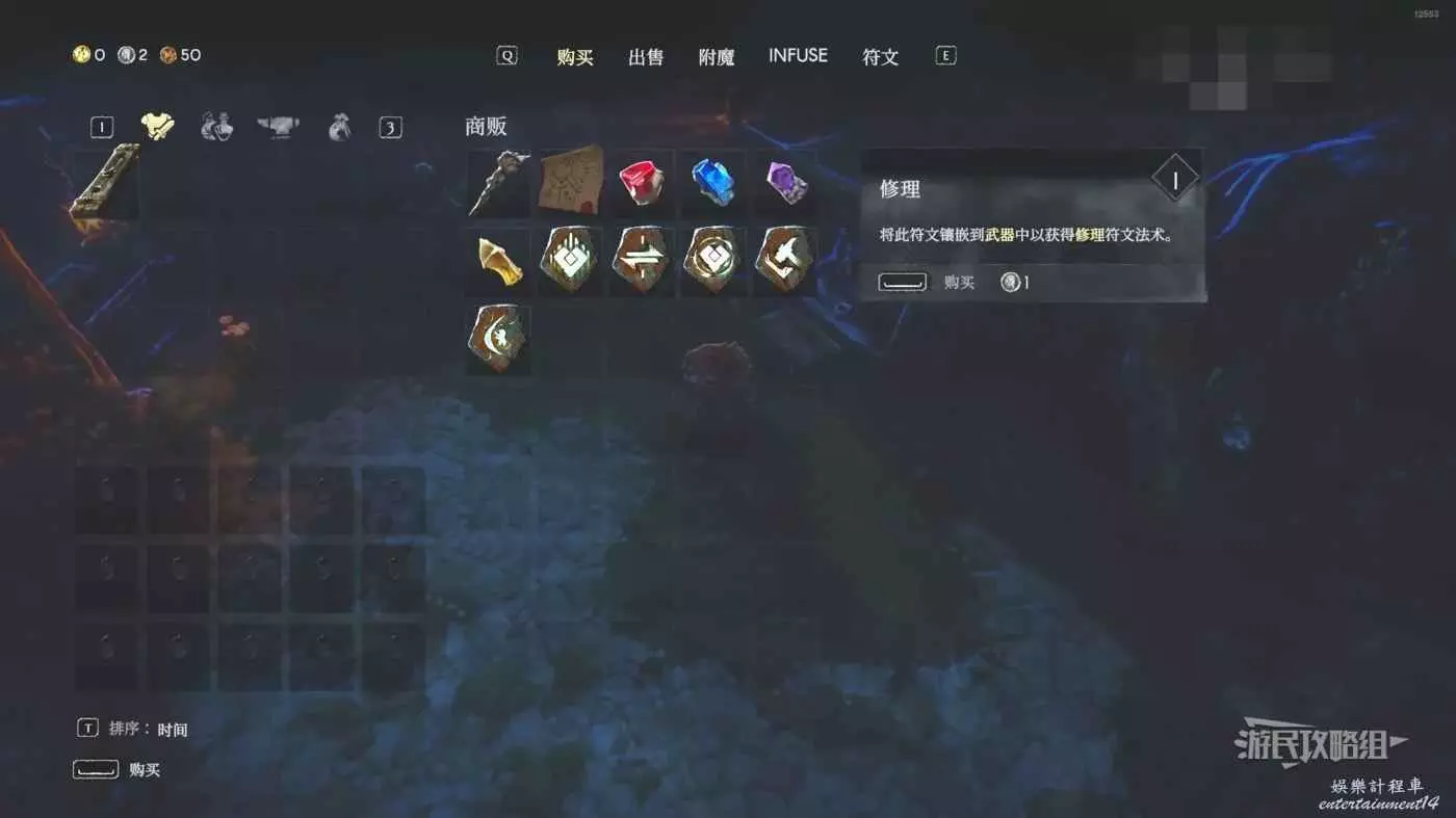 購買之後將【修理】符文鑲嵌在武器上。副手主手都可以,也可以額外準備一把不用的武器來專門使用修理符文。