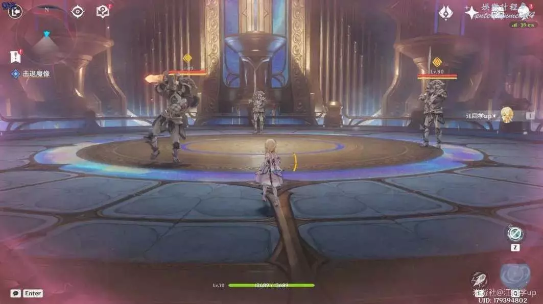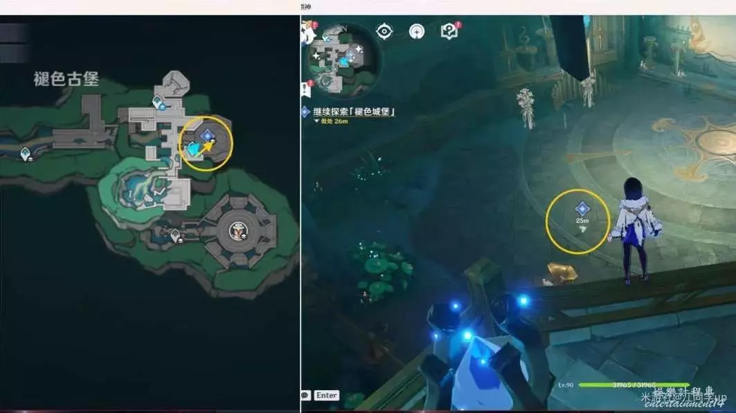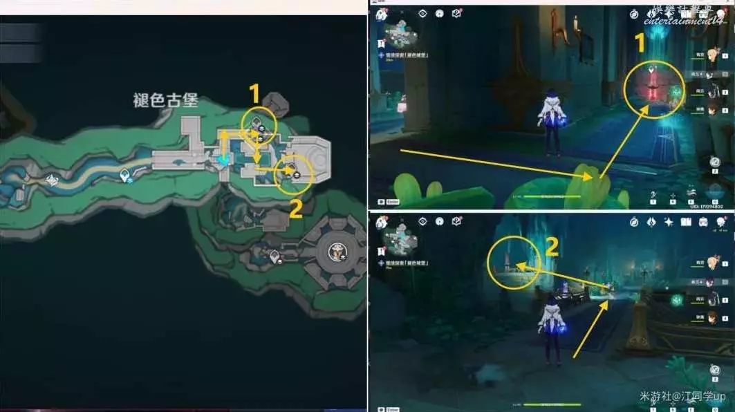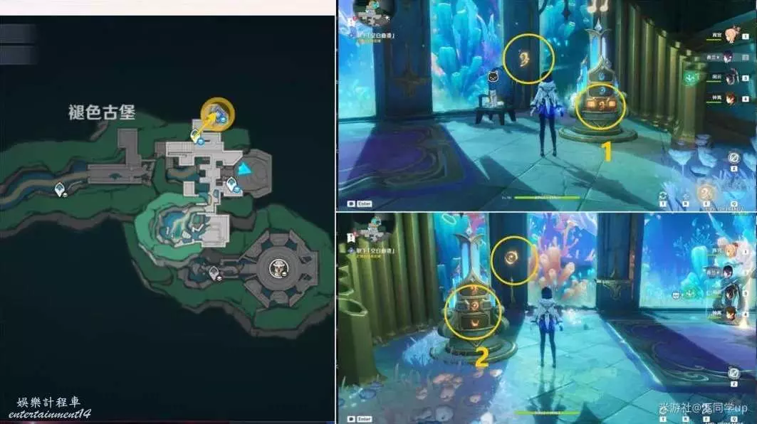 (3)接著傳送到上面1錨點,去下圖2個任務點完成解密,先按T鍵後,再長按E技能啟動1裝置,1裝置會上下滑動,當滑動到和對面柱子上相同音符時鬆開E技能,點亮柱子上的音符後,該處解密完成,然後同理,再去解密完2裝置後,該處解密完成