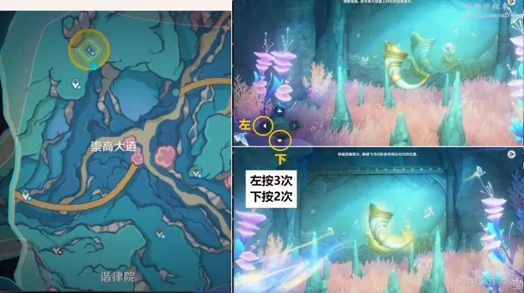 (4)最後站在號角上,將3飛鳥周圍的風史萊姆打掉,3飛鳥歸位後,該處解密完成,最後跟隨飛鳥出山洞