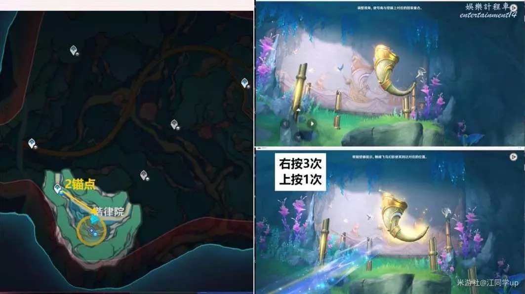 (2)接著來到山洞裡面任務點,移動號角,使其與對面牆上的號角圖片重合(右按3次,上按1次)