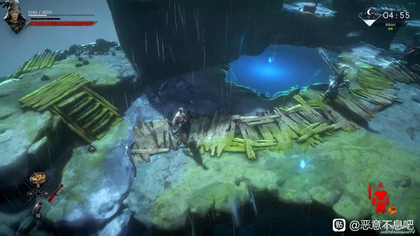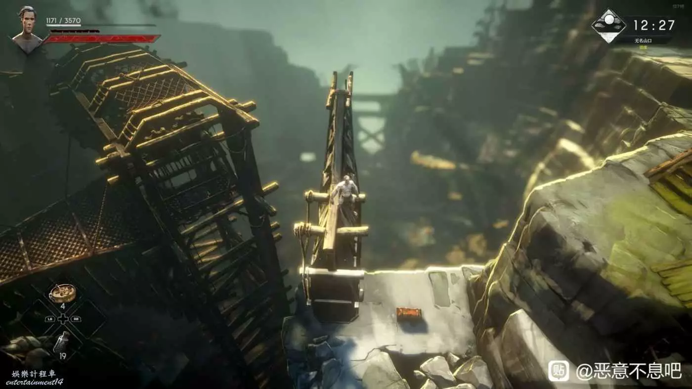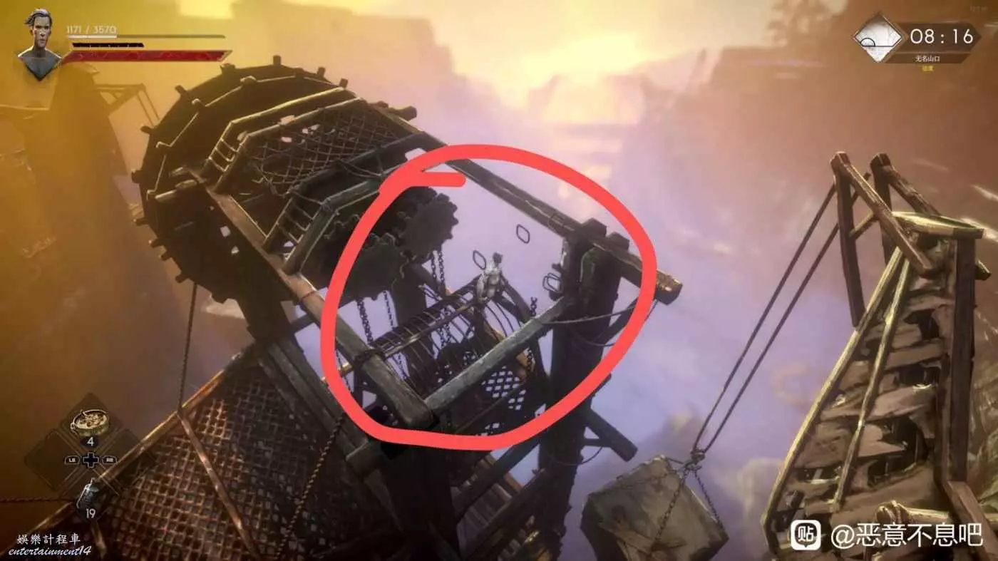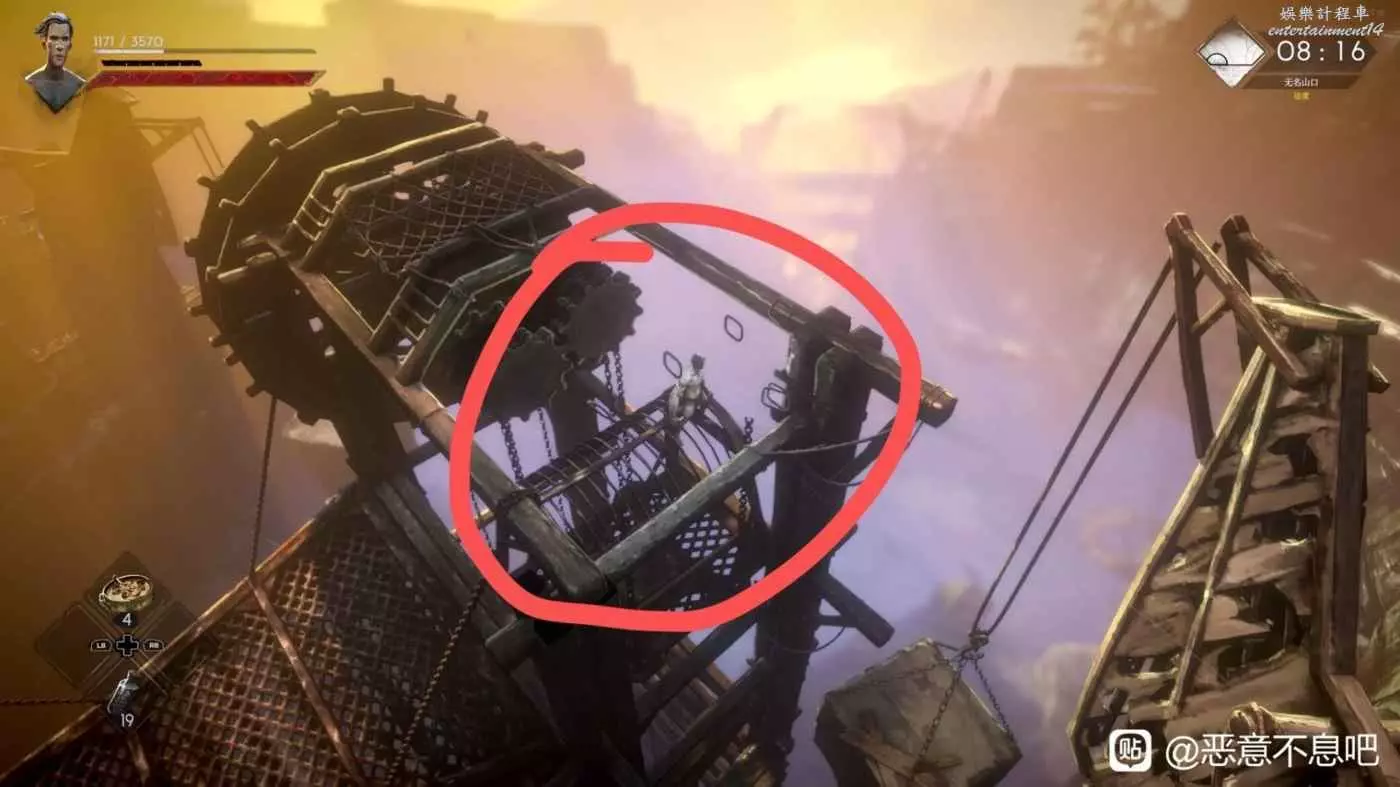 這一步比較難,說下細節,面朝橫樑的時候多推搖杆小碎步找下位置,有些地方是沒有碰撞體積的,找到位置了按住A鍵(跑步鍵)一路爬上去(注意角色會向上爬兩次才能到達頂端,要一直按住,角色爬了兩級後再鬆開,如果爬了一級就鬆開的話大幾率會被卡住,第二級就爬不上去了)