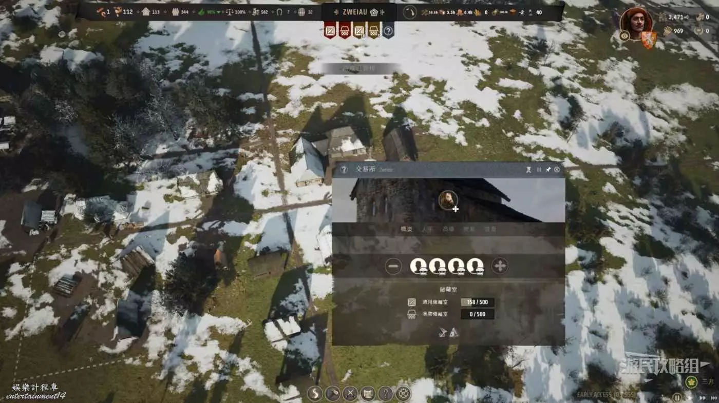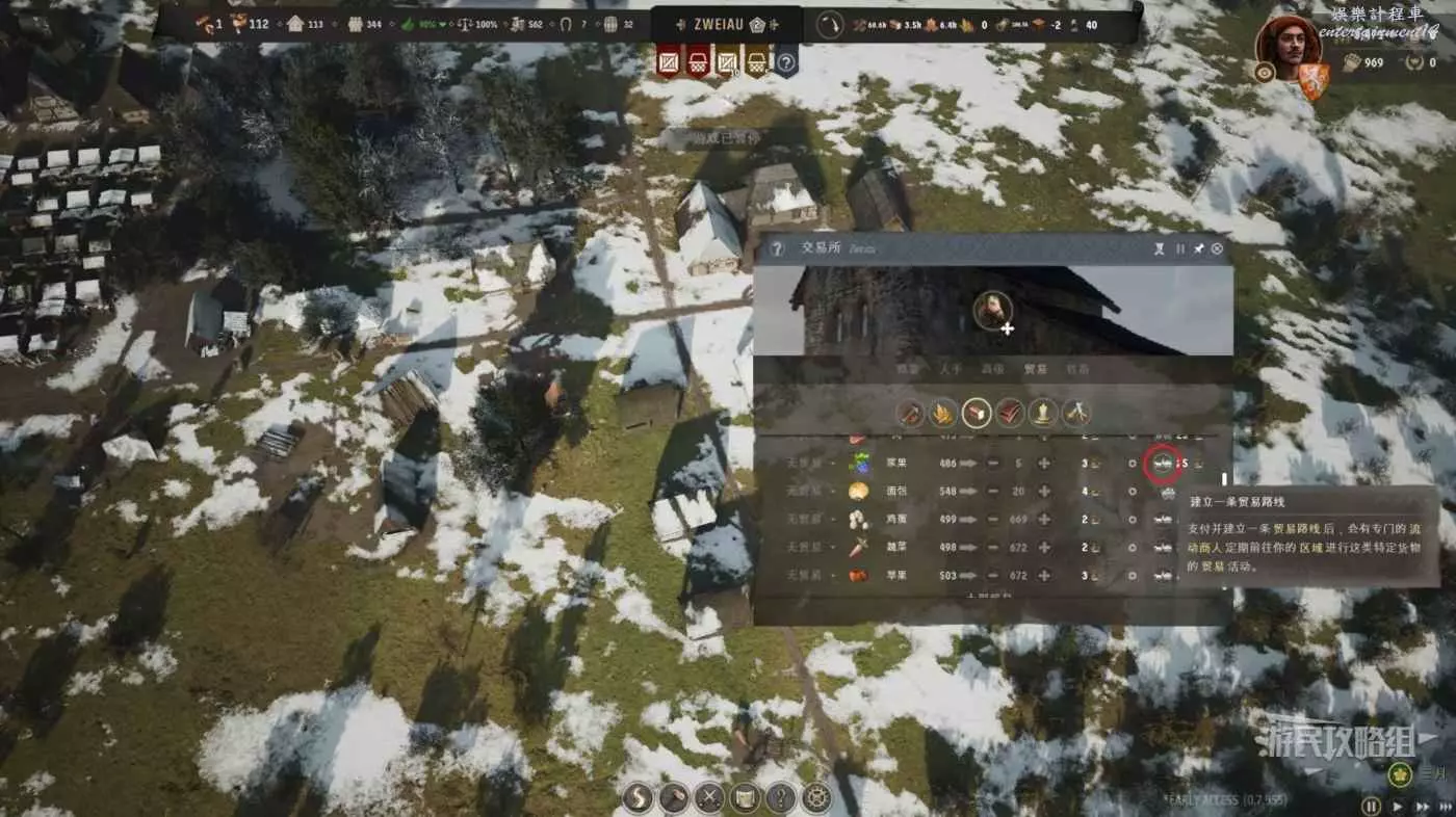 打開建築功能表的貿易選項建造一個交易所,然後在交易所的旁邊建造一個倉庫與一個栓馬柱。三種建築全部建好且需要交易的礦石生產開始穩步推進代表我們已經完成了前置需求。