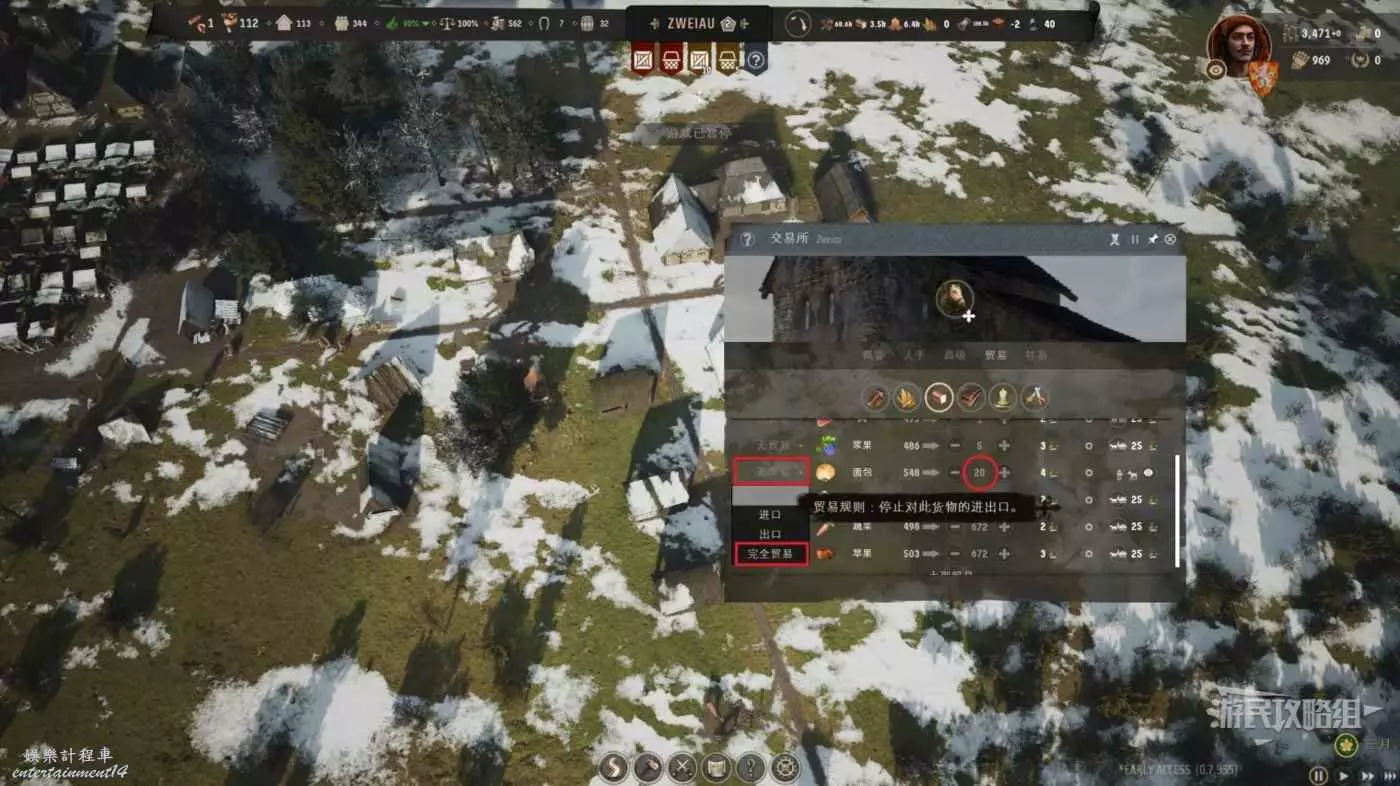 在麵包這一行的左側選擇“完全貿易”,此時我們需要決定期望剩餘物品的數量,直接改成0。