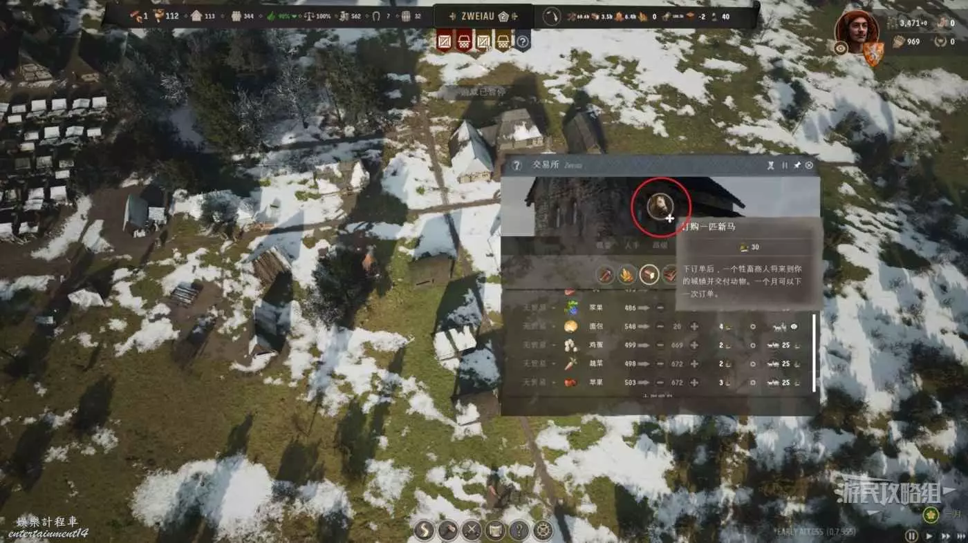 中間不要忘記每過一個月點擊交易所頁面上面的購買新馬按鈕來購買新的運輸牲畜,升級栓馬柱為小型馬廄,栓馬柱只能夠留一個牲畜而小型馬廄是兩個,如果此時還不能升級就多建一個栓馬柱,牲畜越多運輸效率越高。
