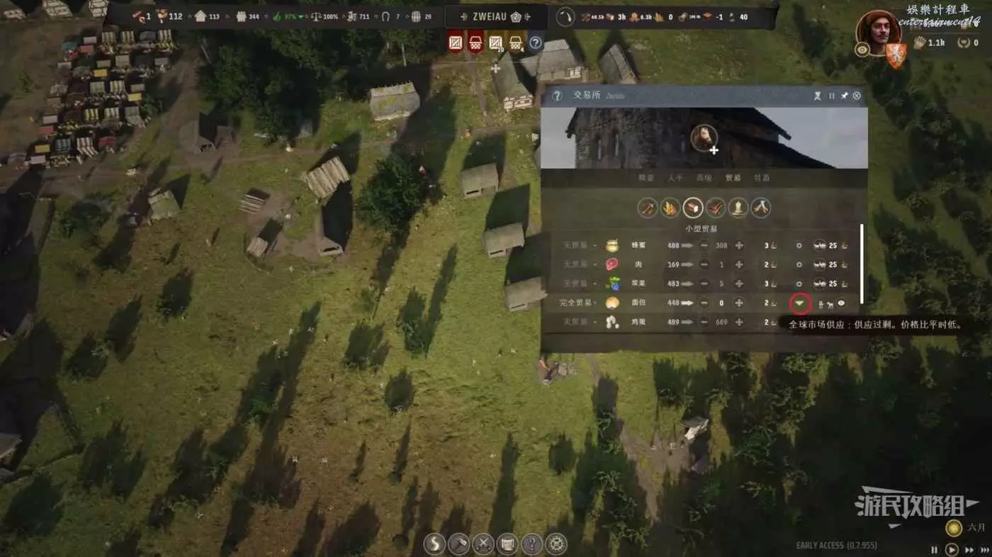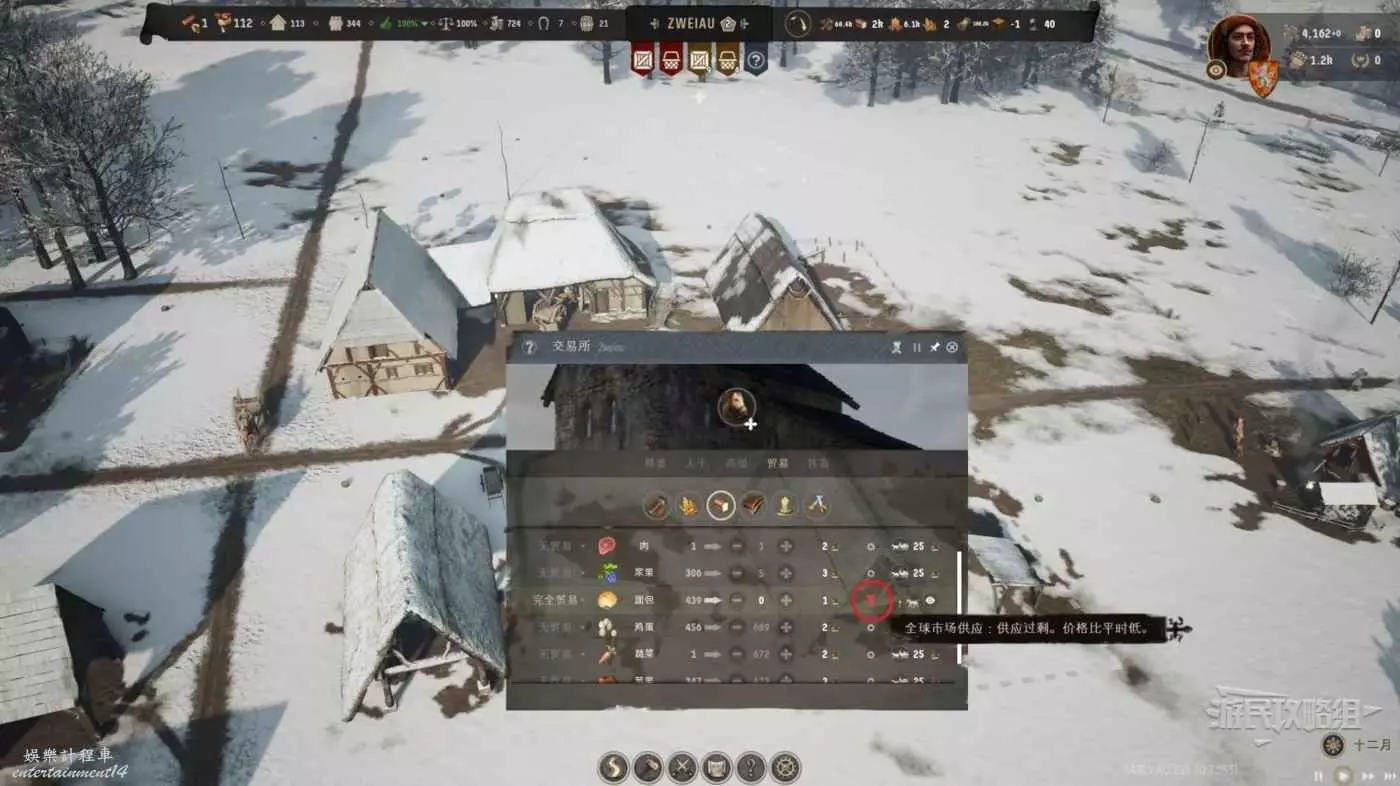 等到第二個月能夠發現麵包的價格降到了最低谷,此時1塊錢就能買一個麵包,我們把左側的完全貿易改成進口,把所有的錢全部拿來購買低價麵包,等待數個月時間麵包的價格會開始上漲,此時我們將所有麵包存貨高價售賣出去。