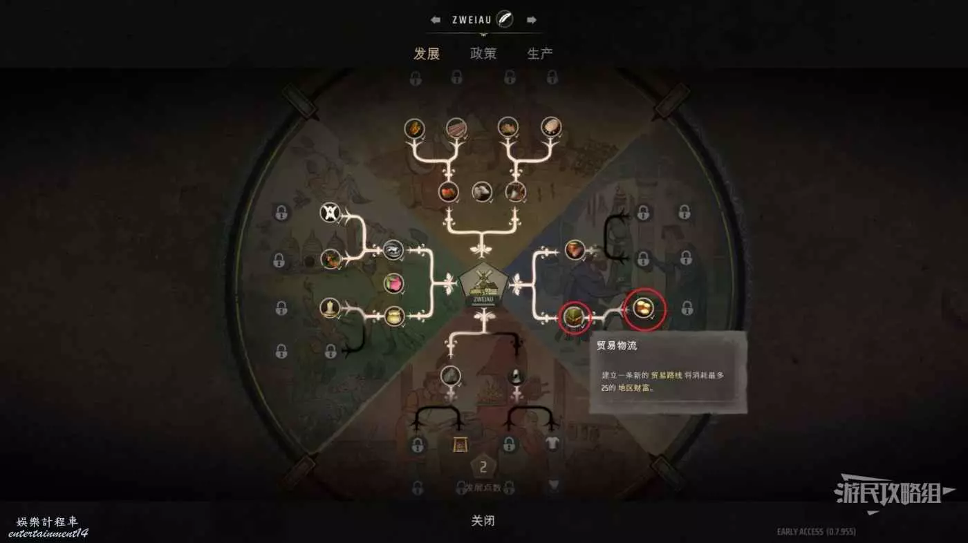 在貿易往來中間也不要忘記發展城鎮,獲得發展點數優先點亮右側的【貿易物流】與【優先貿易】,其中優先貿易可以讓我們進出口一個價格,是非常實用的技能。