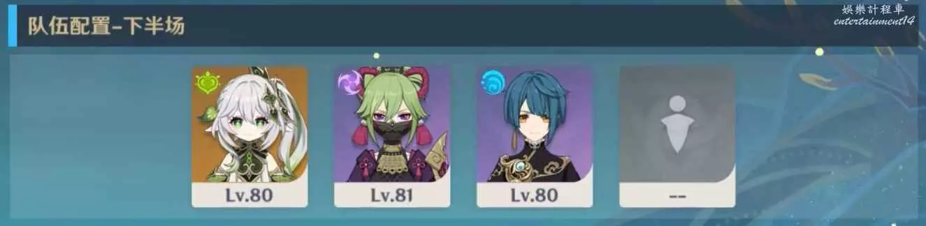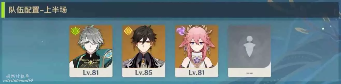 上半場:草/雷C+長軸掛草/雷元素的角色+盾奶