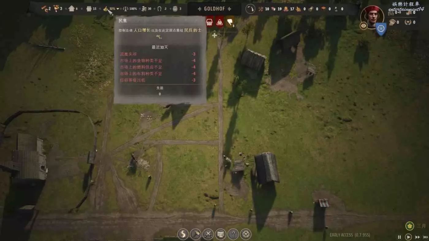 3,困難難度居民不住房子會有”流離失所”減民意,住房子後如果沒有木教堂、煤炭、服飾、食物的市場供給會有相應的詞條減民意,相反則會增加民意。