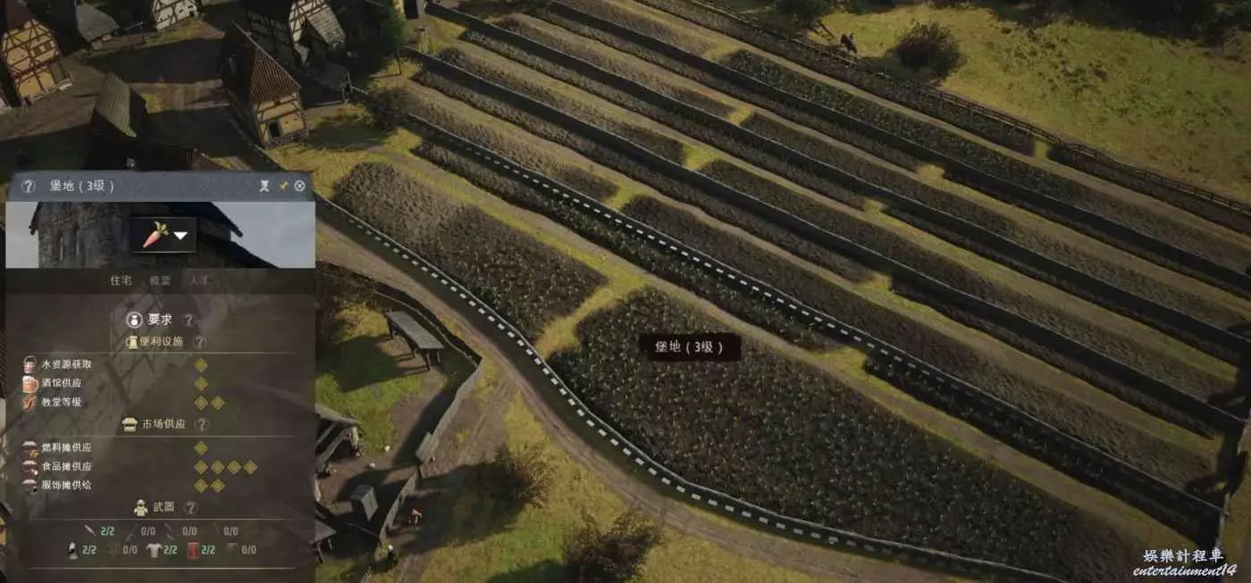 如果追求食物產出最大化,蘋果雞蛋(和生產獸皮的羊)都修一級不帶有擴展空間的堡地;胡蘿蔔看後院大小,一般保證有一個堡地內有兩戶家庭。