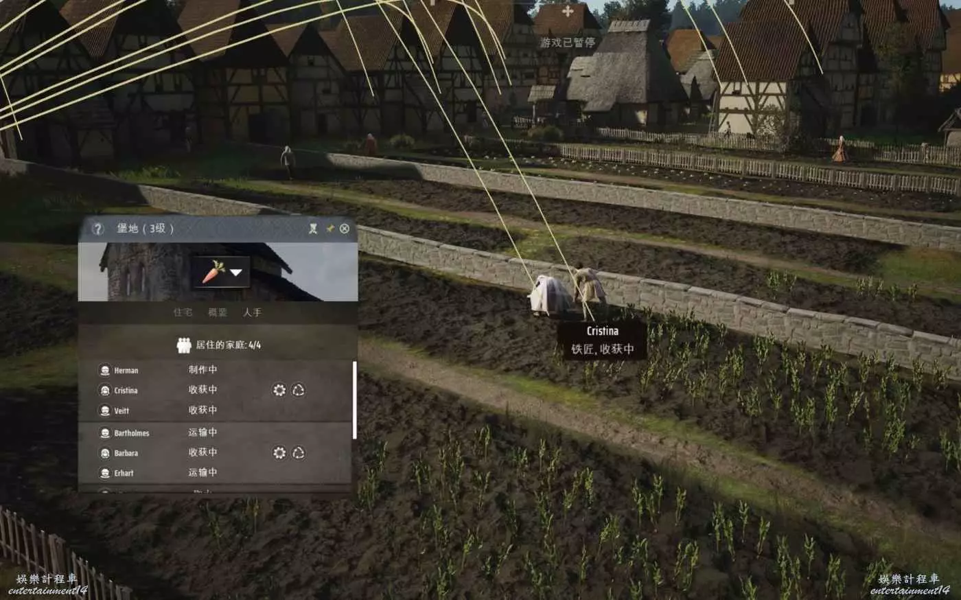 這遊戲胡蘿蔔需要真的有人走到後院佔用時間幹活。居民在外面工作與在後院工作的優先順序我還沒搞清楚。但可以肯定的是:如果堡地沒人,後院無產出;如果菜地缺少打理,會影響蔬菜產量。