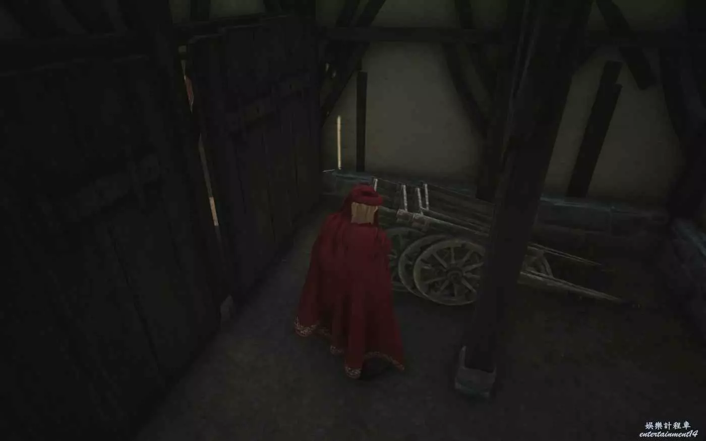 如下圖,二級建築裡的漢斯坐在桌子上喝酒
