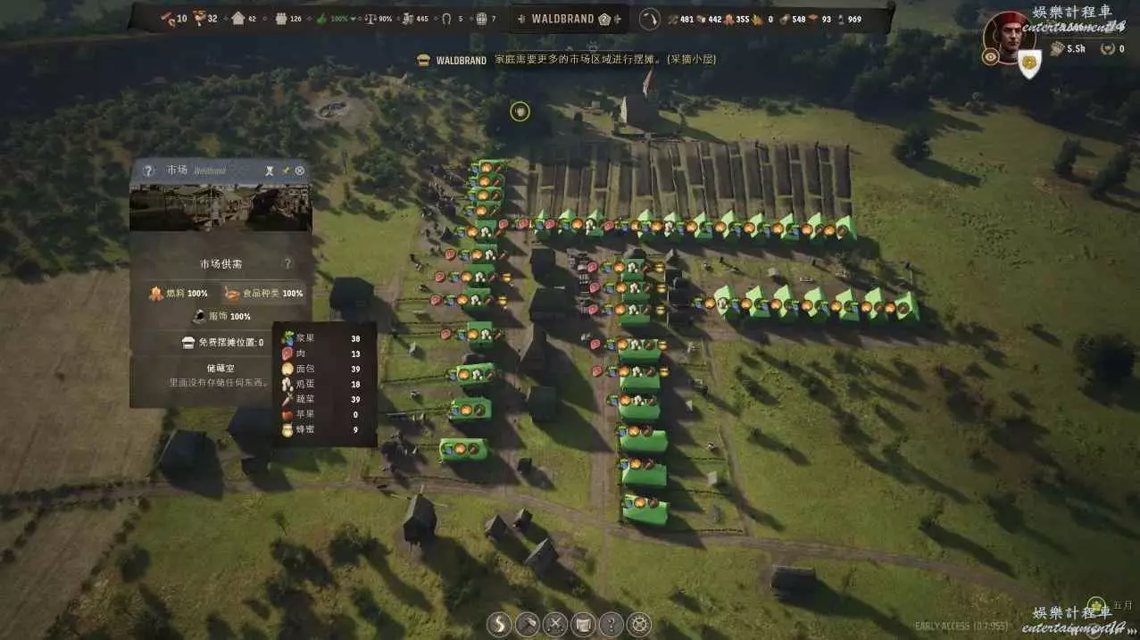 看完機制,解決辦法很簡單,就是在中心區造市場,市場緊靠倉庫和糧倉,讓倉庫和糧倉員工開攤,如果其他人占了攤位,把他工作關了,等倉庫和糧倉員工占了攤位再開。倉庫和糧倉員工有小推車,且閒置時間更多。市場靠近倉庫和糧倉則運貨距離更短,補貨快。