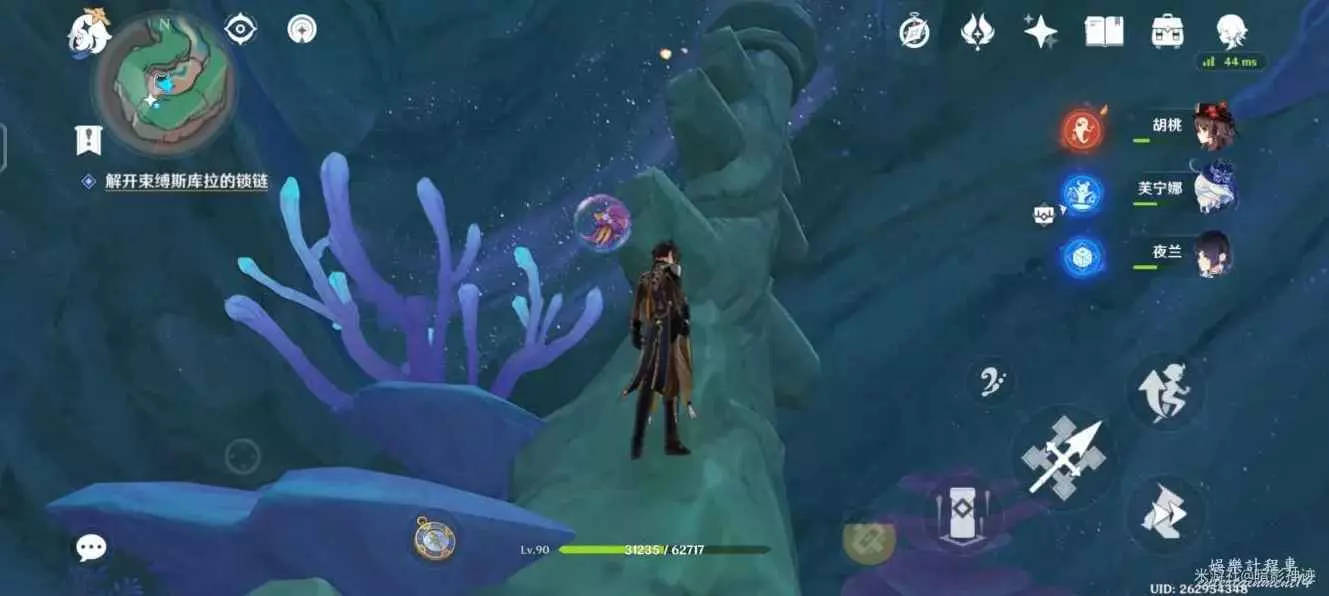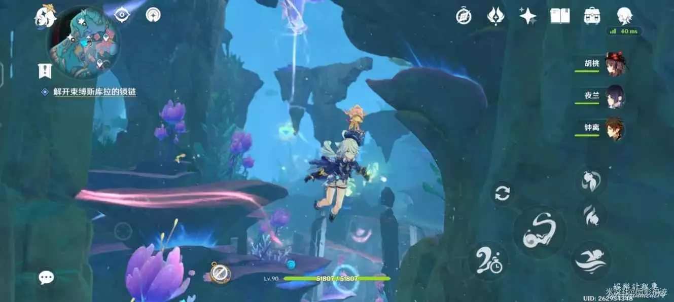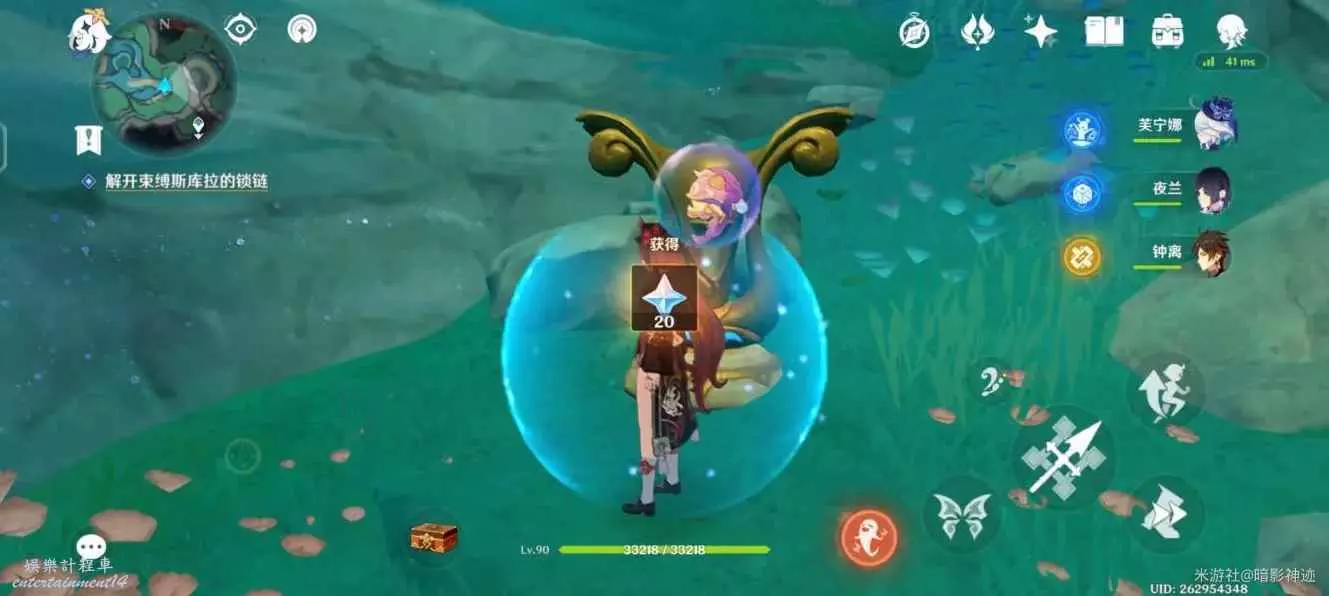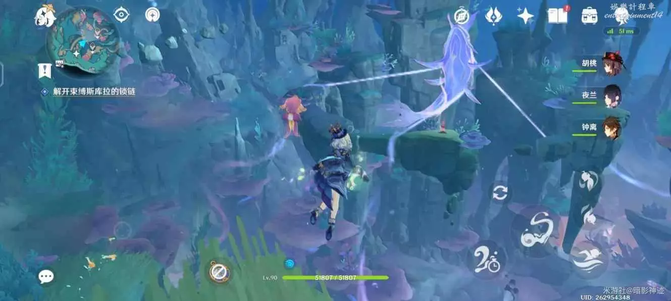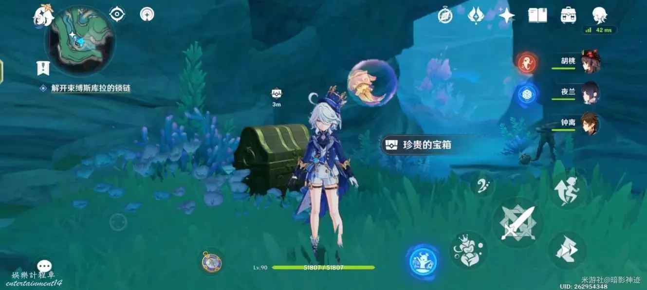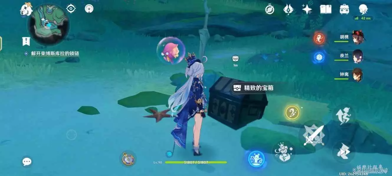 之後,我們來到最後一處鎖鏈的位置。在這裡,我們需要讓海葵處於共鳴狀態,很簡單,我就不說明了。之後,和之前一樣的方法解除鎖鏈即可獲得一個珍貴寶箱並且解鎖成就『曾與世界為敵』