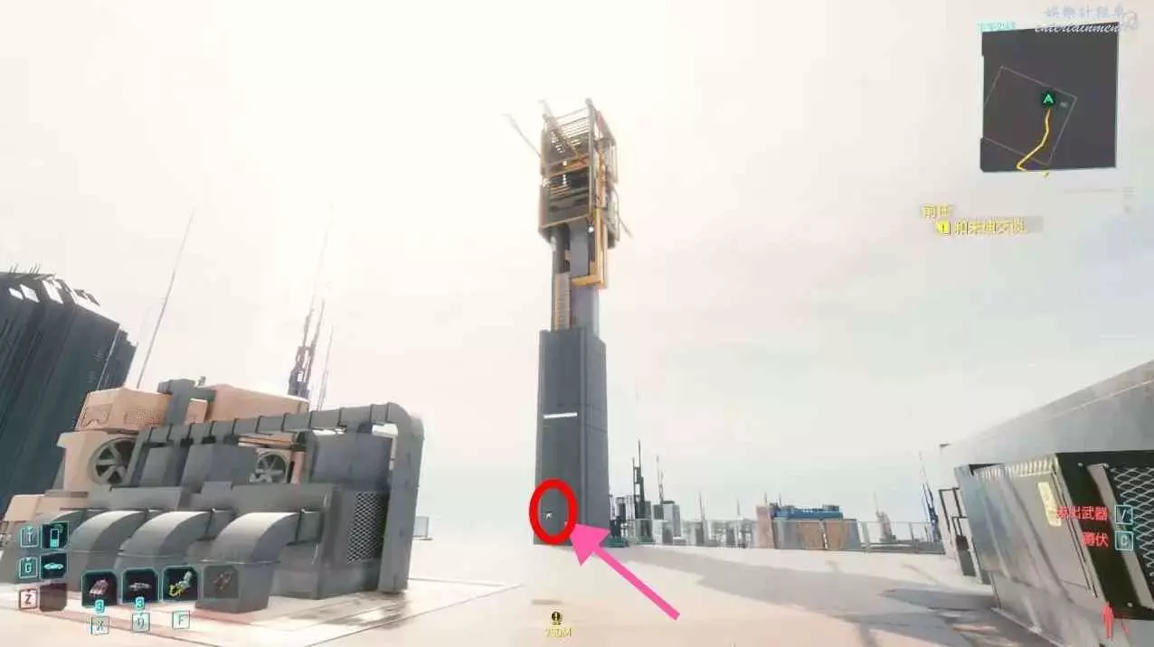 在樓頂找到這個柱子,然後在柱子上找到電梯按鈕,按下去(找不到的建議多轉兩圈)