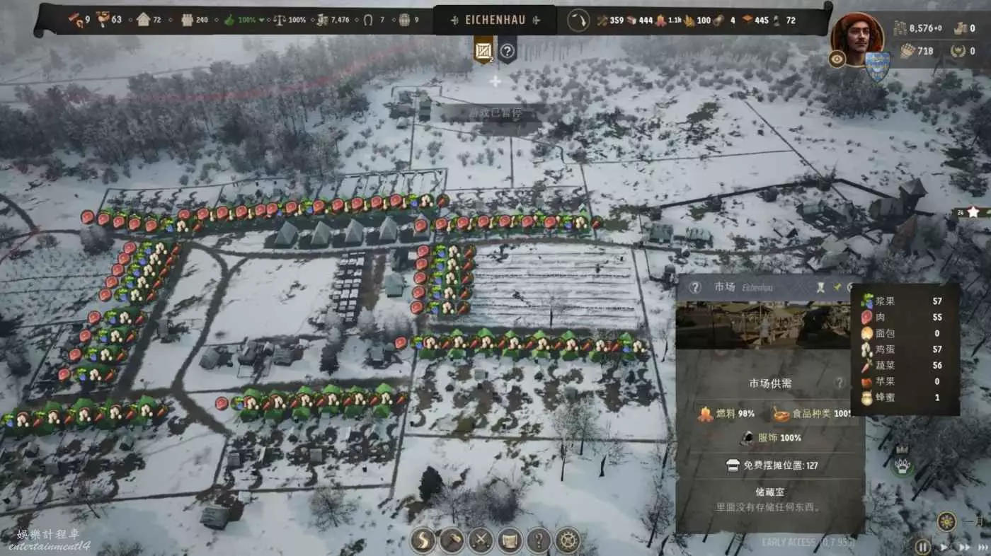 普通漿果,單營地,距離很近,不擺攤全交給糧倉叫賣,不夠吃,大約只能供應半年多。富漿果近點雙營地應該還是能吃滿的。