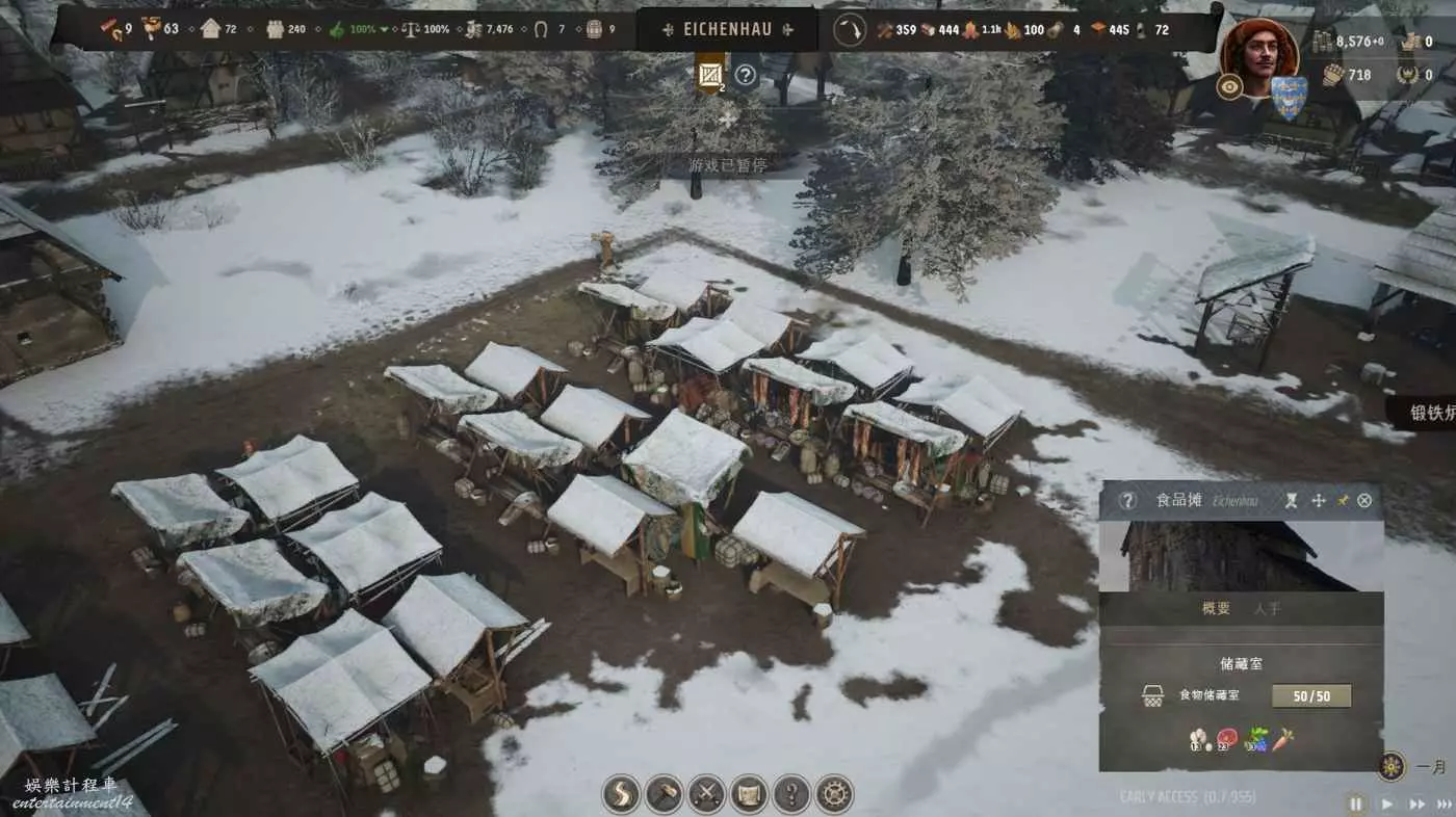 富獵物,狩獵科技,狩獵政策(無法種地),單狩獵營地,距離動物很近,不擺攤全交給糧倉叫賣。2個劣人供應量大約是250人口。增加營地的虛空增量應該也不低。