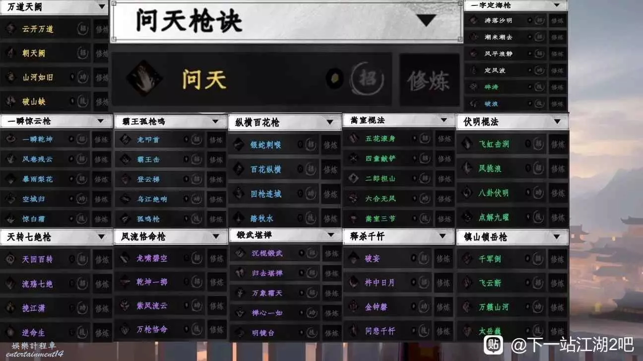 11.金.問天槍訣(主線與駱家軍駱星不要殺他,後續你會收到他的傳書,來到1421,819殺掉奔狼將軍後回信上交寶劍,將獲得的奔狼令出示給1534,971的閻無雙,然後和他對話共商反攻,這裡開始後有指引,接到覆滅穆特後又沒有指引了,來到1743,1879殺掉所有穆特人,作者這裡出bug殺掉所有人任務仍舊沒完成,也是無可奈何,完成後會收到陳千柳傳信的問天槍訣)
